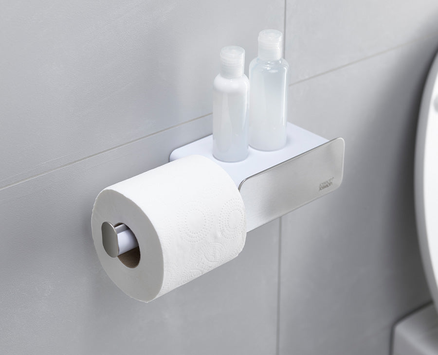 This smart wall-mounted toilet roll holder has several additional features including a handy storage shelf with an integrated small drawer beneath it that’s perfect for discretely storing sanitary items.