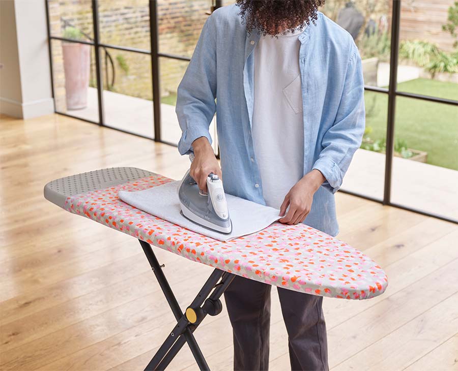 This ironing board offers a fast and simple setup, with seven adjustable height settings. When not in use, the board folds down for compact storage.