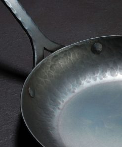 The Heritage Collection represents Blanc Creatives most unique and elusive pieces of carbon cookware, each pan entirely hand-forged using heat and hammer as in Blanc’s earliest days, the sidewalls bearing the many hammer marks of its handcrafted origins. At the Virginia workshop of Corry Blanc and his team, each pan is formed one by one, the forged iron handle with heat-dissipating, two prong handle design secured to the 9″ base with oversized steel pins. Beautiful details abound, adding style to a tool that is as functional as it is elegant: carbon steel performs excellently on all heat surfaces including electric, glass, induction, and gas stovetops, as well as for cooking outdoors over an open flame.