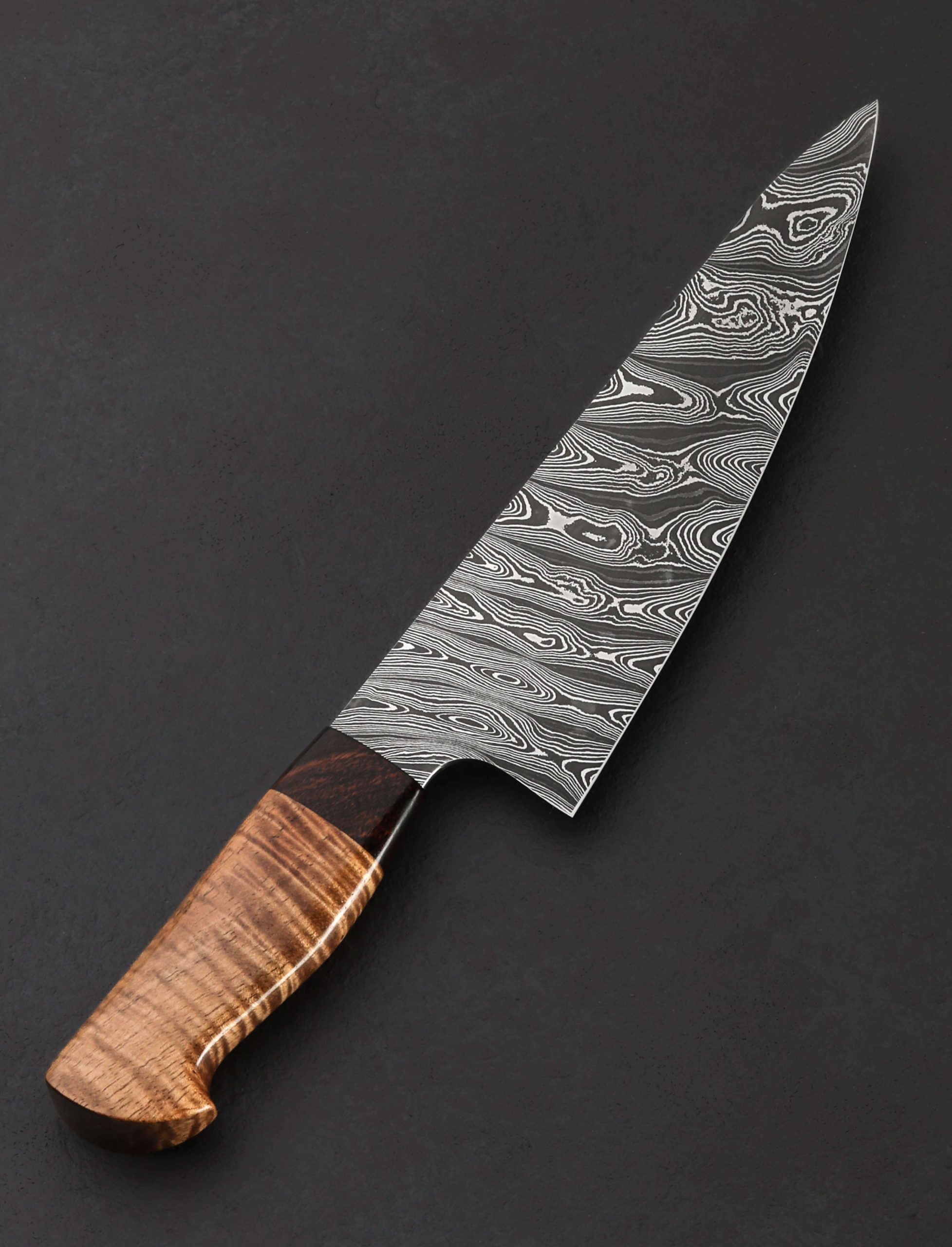 Master Bladesmith Aaron Wilburn’s first piece to grace our collection in some time is an absolute beauty: simple, elegant, and packed full of utility for the chef’s kitchen. At 208mm / 8.2″ long, the blade’s edge sweeps upward from a versatile, 61mm tall heel to a high, strong, and pointed tip, providing ample curvature for rocking on the board and tackling the largest of cuts. Thin, hard, and razor-sharp at the edge, Aaron has shaped this one-of-a-kind chef knife from a house-made carbon damascus steel in a twist pattern forged by hand from 1084 and 15n20 alloys. Designed and built at his Idaho studio to be the workhorse of any kitchen, Aaron balances finesse and precision with a ready-to-work feel capable of all manner of daily meal prep. Filling the hand with a tall, beautifully sculpted profile, the Western-style hidden tang handle is carved from Hawaiian Koa wood with a tapering ferrule of Arizona Dessert Ironwood.