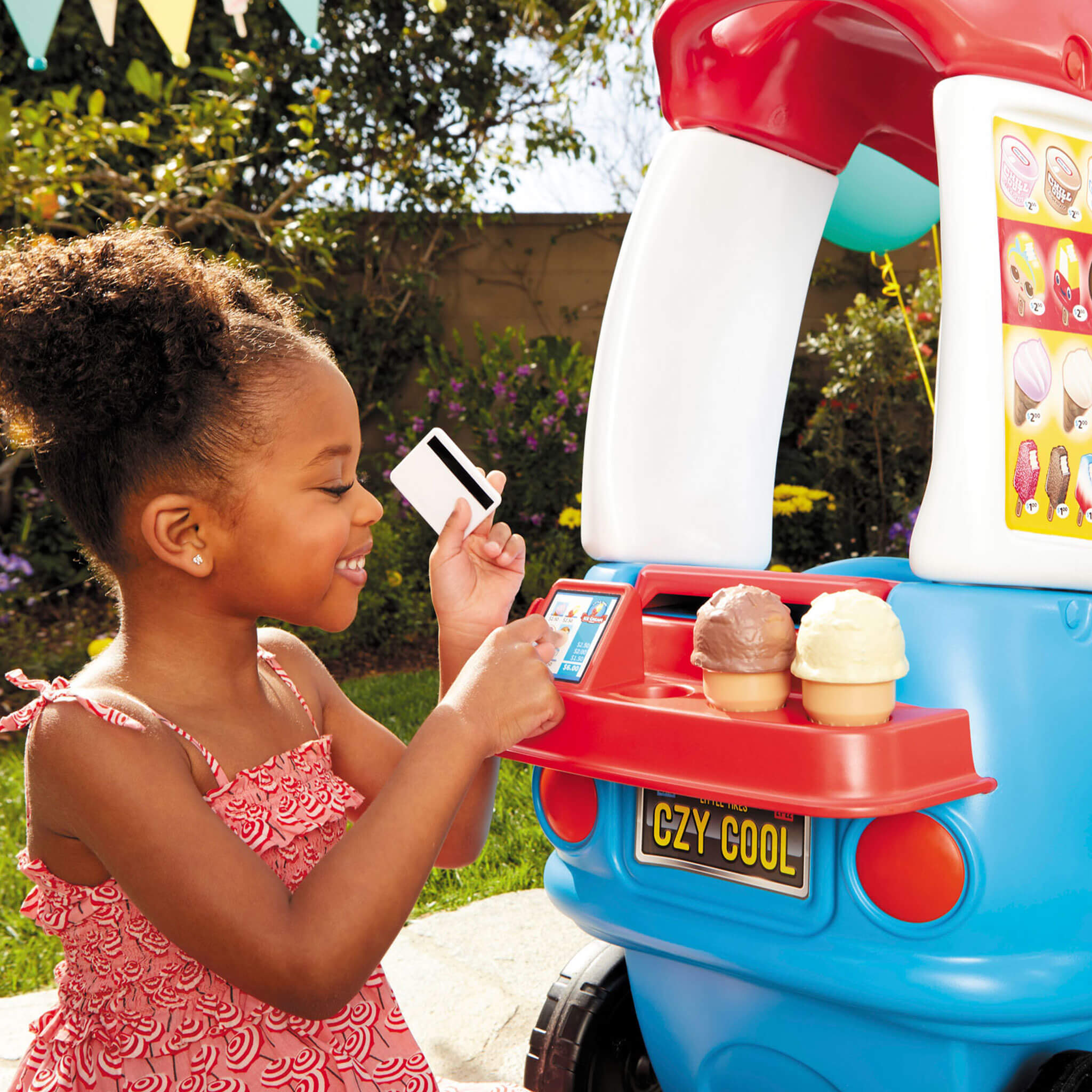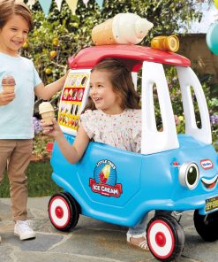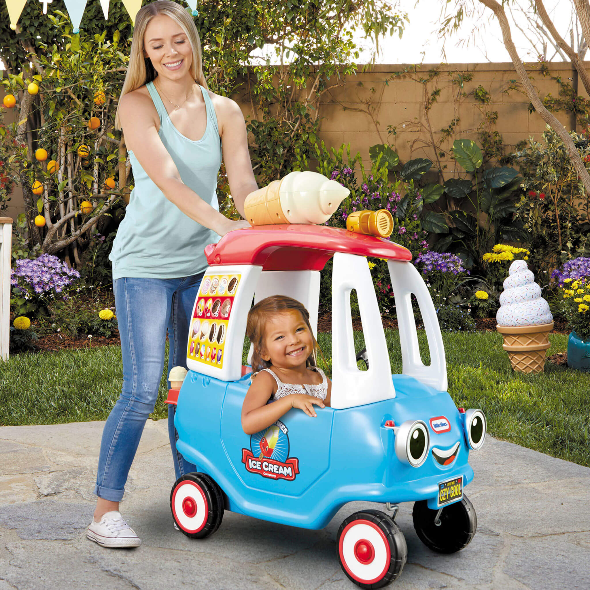 The iconic Little Tikes Cozy Coupe has been reimagined as a modern-day Ice Cream Truck that can be parent pushed or kid powered. Use the convenient handle to push the truck or remove the floorboard and let your child take control and power the ride themselves. The truck plays modern ice cream truck music by RZA, which will make you quite cool in the neighborhood.