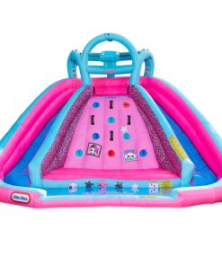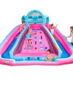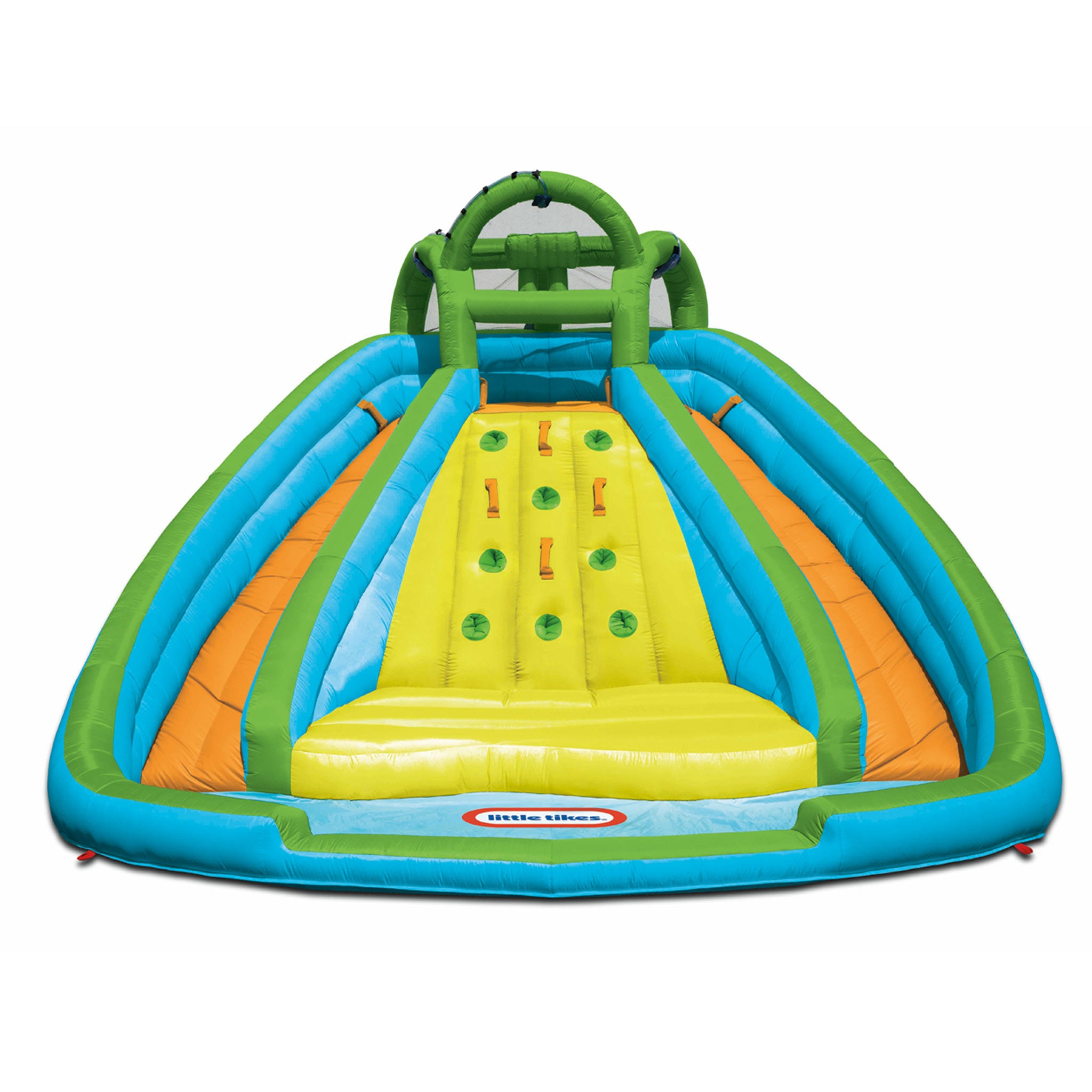 The Little Tikes Rocky Mountain River Race inflatable water slide has two slides and a climbing wall! Kids will enjoy hours of outdoor splashing fun in this water slide bounce house.