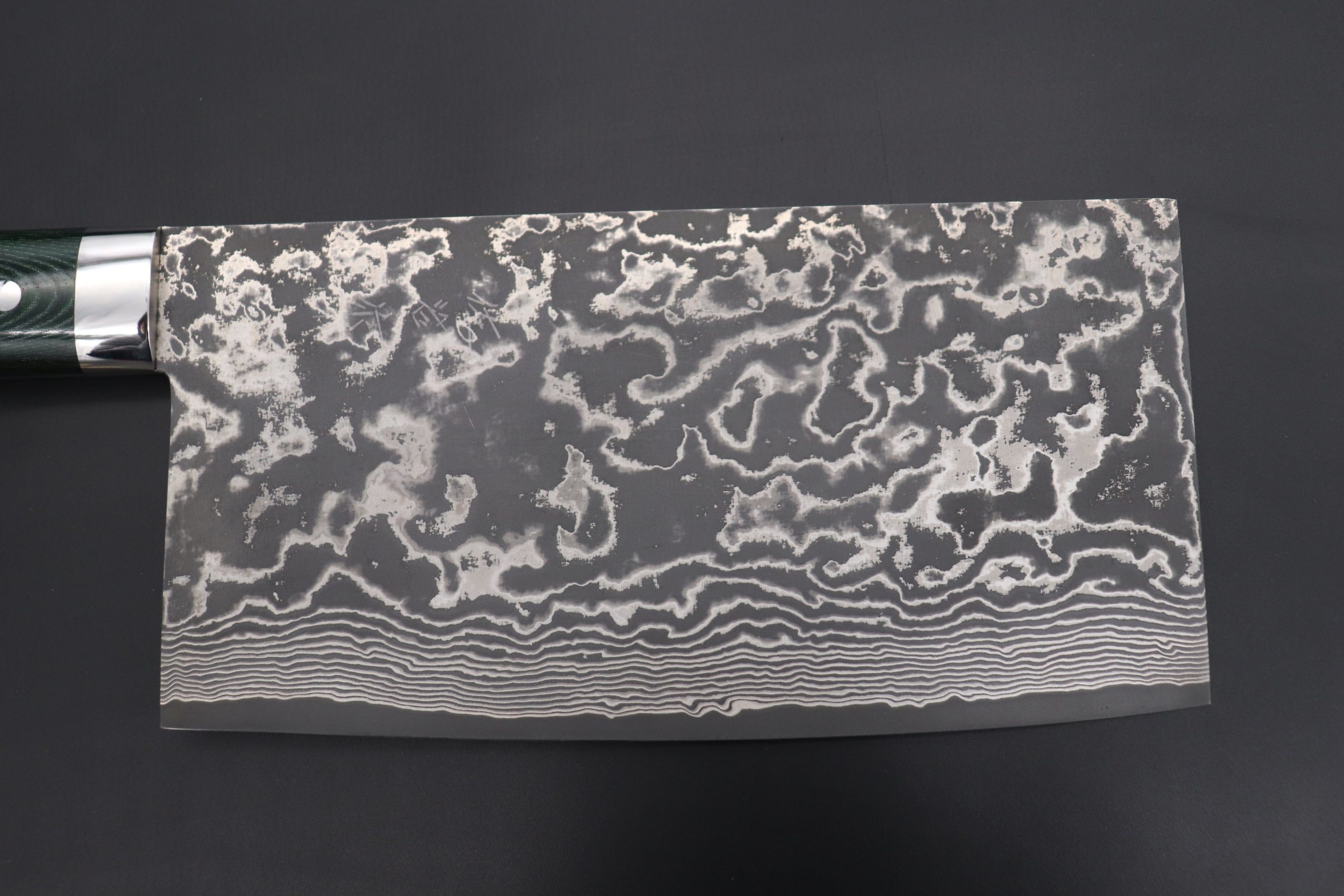 This is the limited custom Damascus Chinese Cleaver that is something different and unique with the craftsman’s spirit. Master Saji chose to use a green and black layered Linen Micarta® for the handle scales, due to its durability, water-resistance and strong resistance to shrinking.