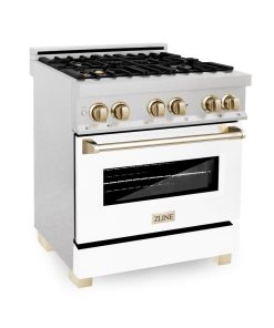 ZLINE Autograph Edition 30 in. 4.0 cu. ft. Legacy Dual Fuel Range with 4 Burner Gas Cooktop and Electric Convection Oven in DuraSnow Stainless Steel with White Matte Door and Polished Gold Accents (RASZ-WM-30-G)