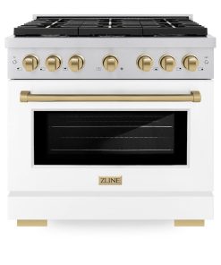 ZLINE Autograph Edition 36 in. 5.2 cu. ft. Paramount Gas Range with 6 Burner Cooktop and Convection Gas Oven in Stainless Steel with White Matte Door and Polished Gold Accents (SGRZ-WM-36-G)