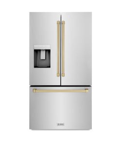 ZLINE Autograph Edition 36 in. 28.9 cu. ft. Standard-Depth French Door External Water Dispenser Refrigerator with Dual Ice Maker in Fingerprint-Resistant Stainless Steel and Polished Gold Traditional Handles (RSMZ-W-36-G)