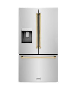 ZLINE Autograph Edition 36 in. 28.9 cu. ft. Standard-Depth French Door External Water Dispenser Refrigerator with Dual Ice Maker in Fingerprint-Resistant Stainless Steel and Polished Gold Modern Handles (RSMZ-W-36-FG)