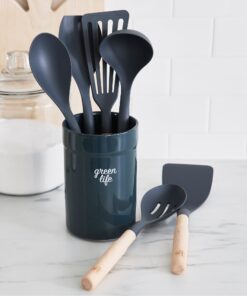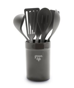 GreenLife Nylon & Wood Cooking Utensils with Ceramic Crock, 7-Piece Set | Charcoal Gray