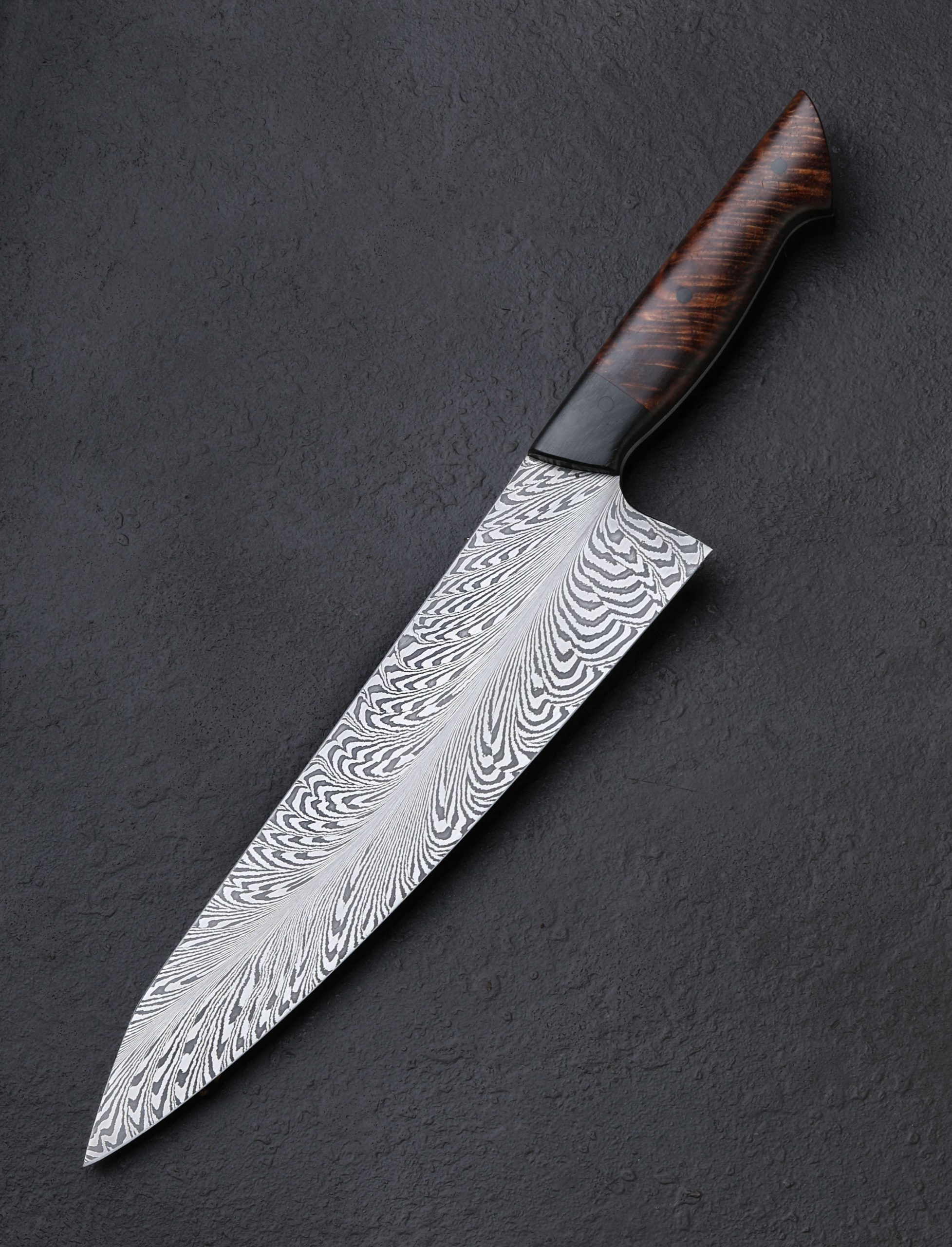 Austrian bladesmith Martin Huber begins by layering bars of 02 and 15n20 carbon steel alloys to form the initial damascus pattern. That pattern is then cut, stacked, and manipulated to create a tiled mosaic. The resulting piece of material is then ‘feathered’ by Martin to produce the bold, flowing effect seen coursing through the blade of this 230mm / 9.1″ chef knife. The magic, of course, does not end there. A prolific maker of full-size, one-of-a-kind heirloom chef’s knives, Martin imbues this blade with the same balance, versatility, and performance-based geometry we expect of his heirloom work. The blade’s tall bevels are subtly convex before slimming to quite a thin cross section at, and above, the fine, razor-sharp edge. Rounded and soft to the touch for comfort in the pinch grip, the blade’s spine tapers progressively, beginning at nearly 3.5mm out of the handle before halving to just 1.6mm at the midway point, and further to less than 1mm an inch from the glass thin, needle-like tip. Due to this careful shaping, the blade is a workhorse in the rear where the spine is stiff and the edge honed for chopping, while it enjoys a touch of lateral flexibility in the forward inches where it will excel at precise slices and detail work. Complementing the damascus steel’s handsome pattern is the striking, natural grain of curly Hawaiian koa wood surrounding a tapering, full blade tang. In front of the koa are bolsters of ancient bog oak to complete a handle sculpted into a comfortable Western form, all secured by three flush, black G10 pins.