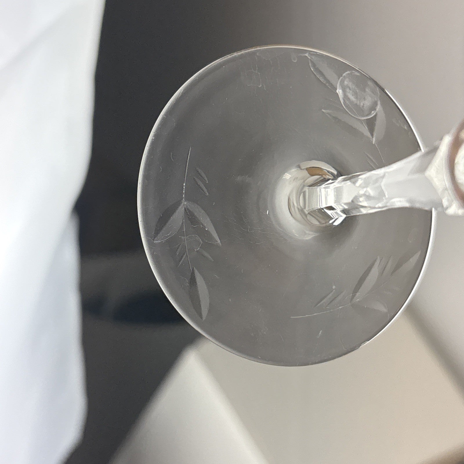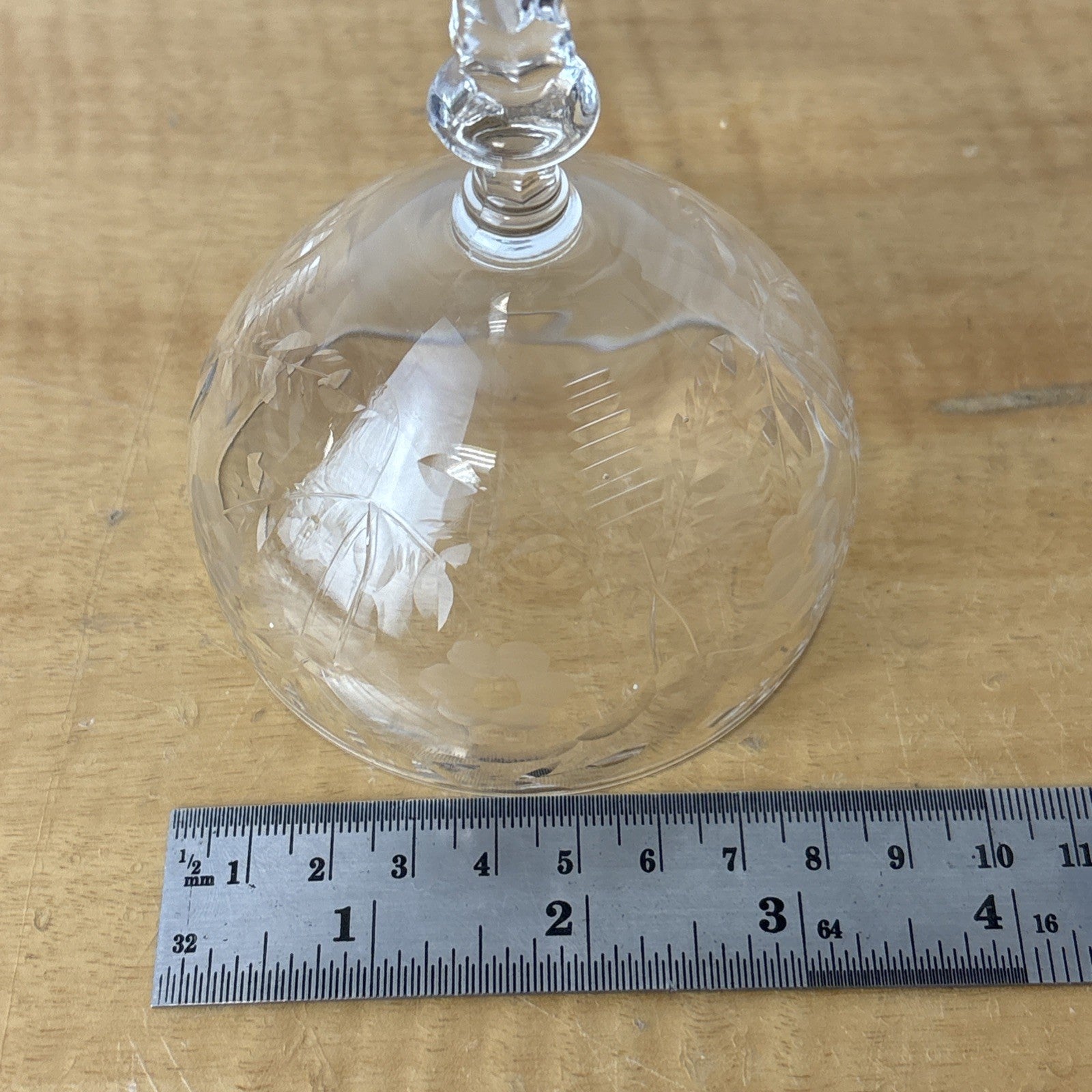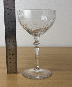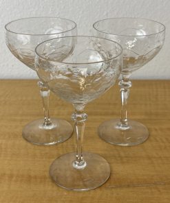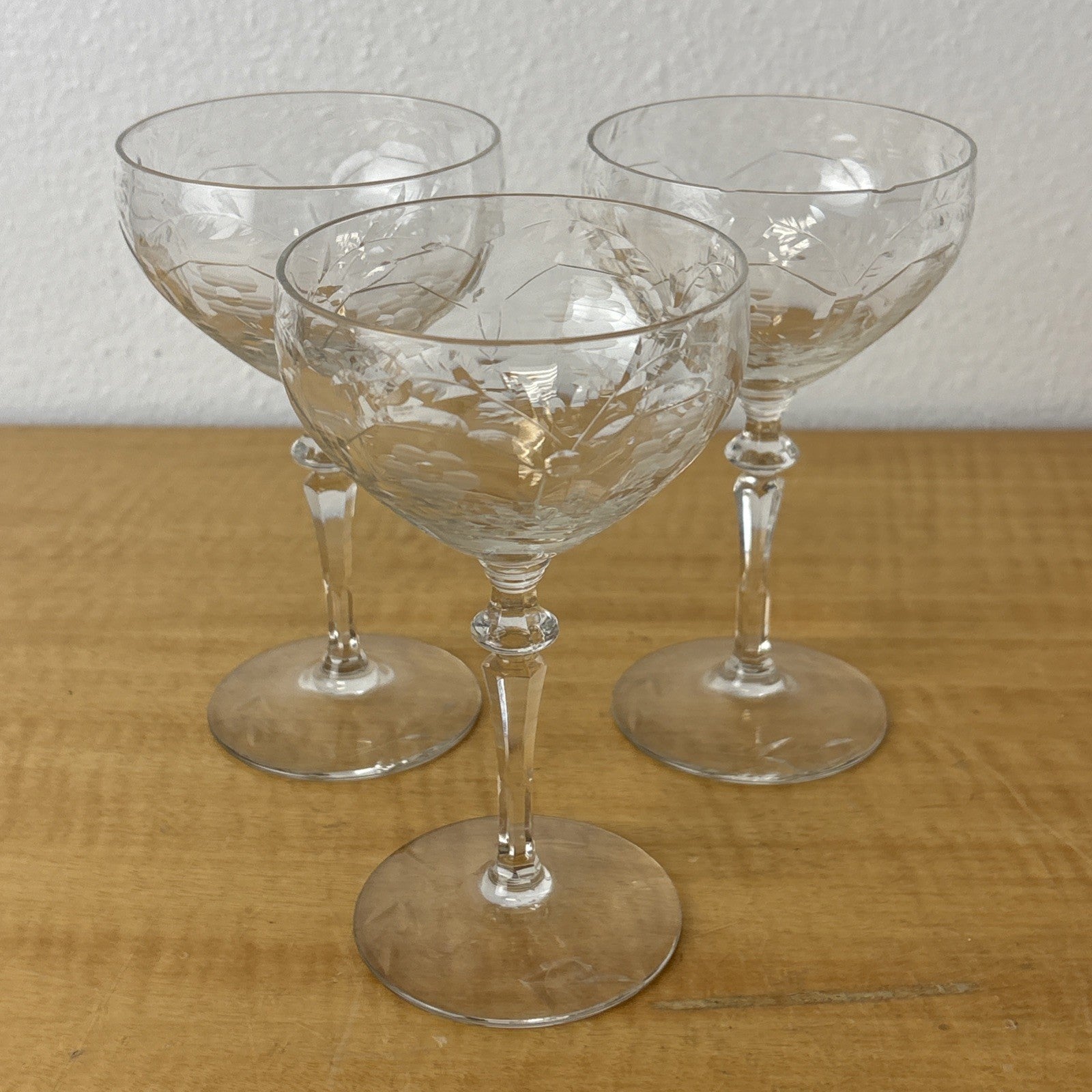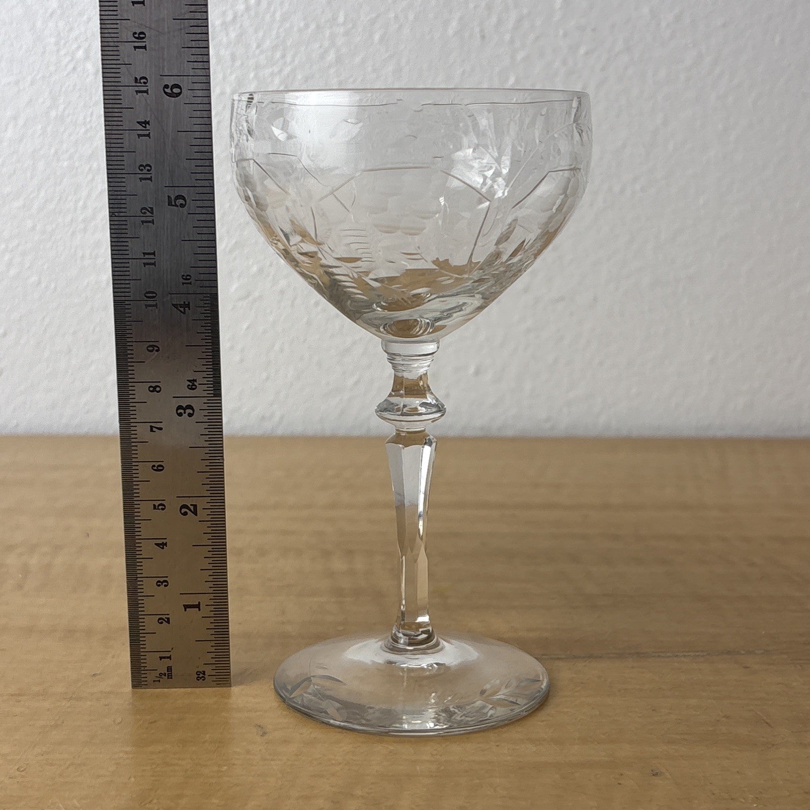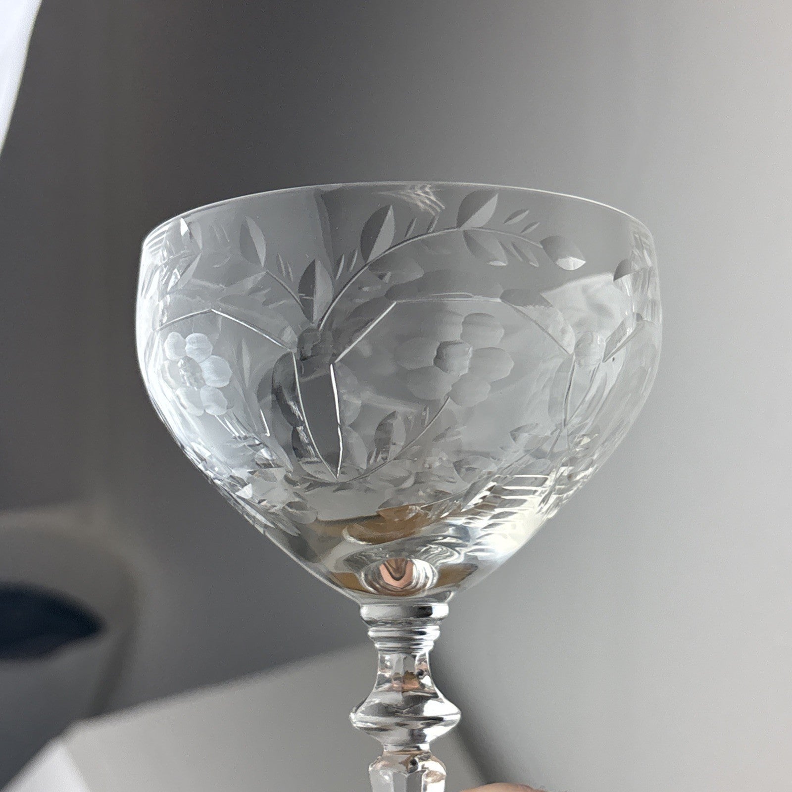 1950s Elegant Etched Coupe Champagne Crystal Glasses ( 3 Available )