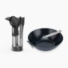 - Weighted steel handles and integrated tool rests prevent utensil heads from touching the work surface when placed down