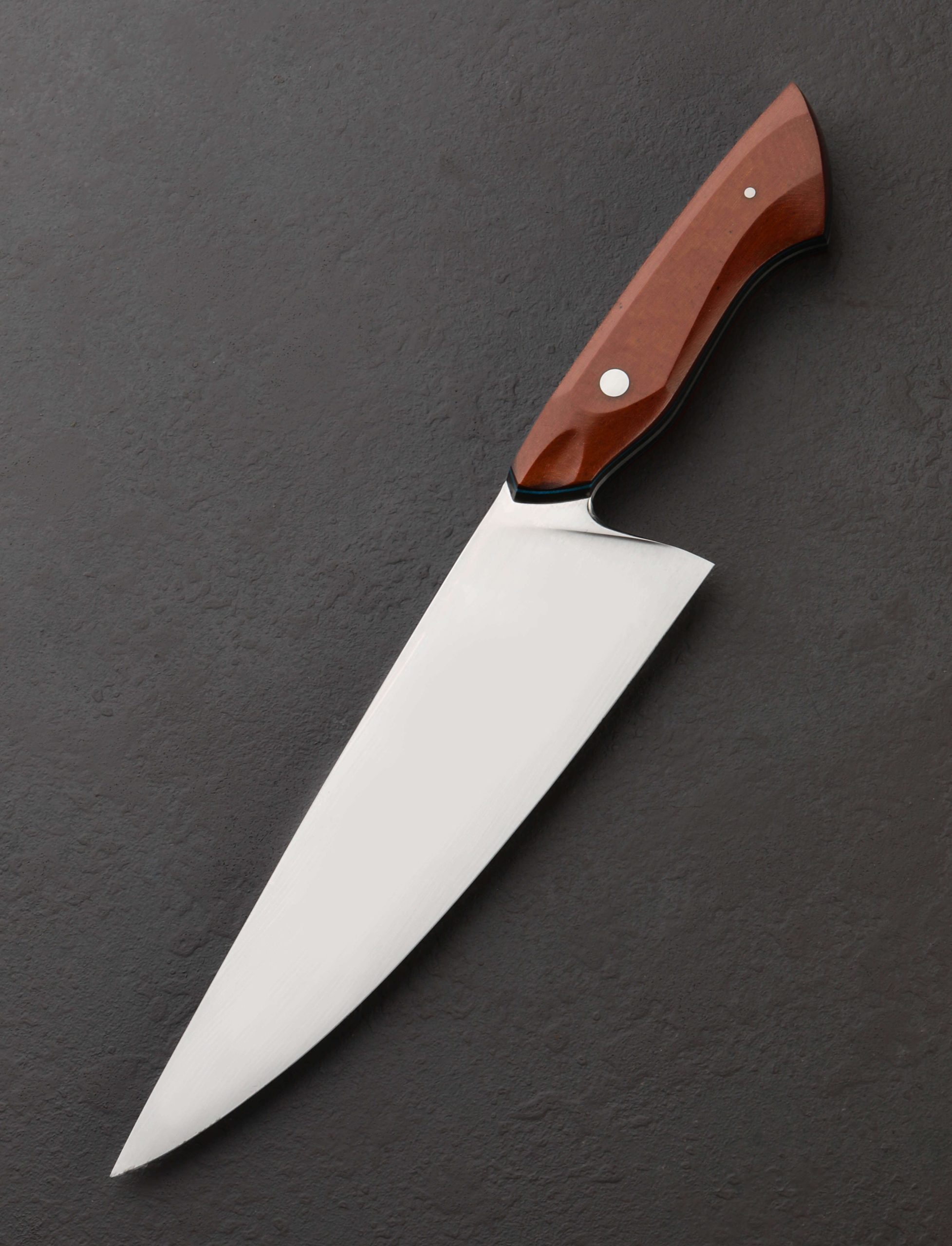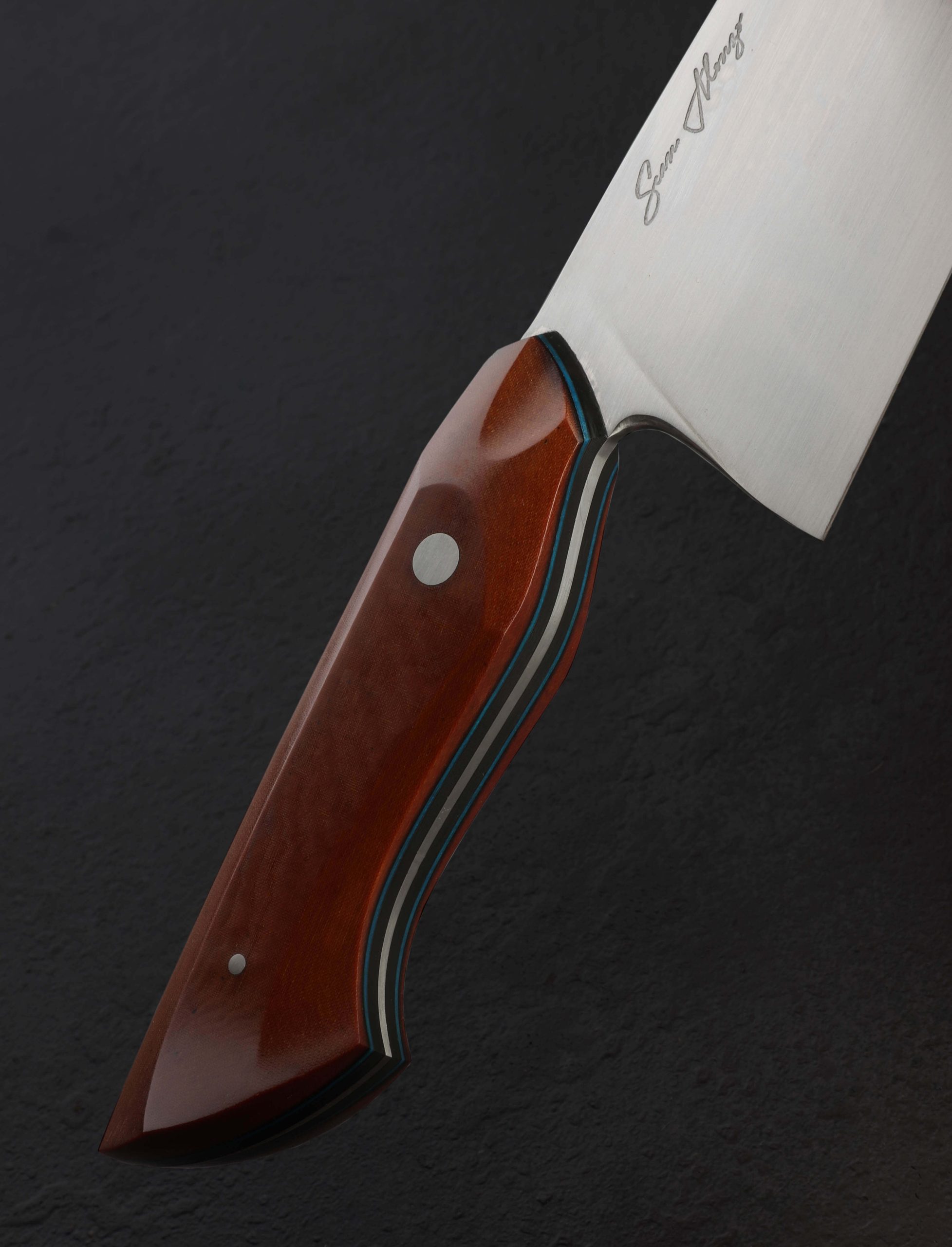 A rare offering by Sean Alonzo of the Philippines is here in stunning, pre-owned, unused, like-new condition. Boasting Sean’s silky, hand-sanded satin finish, the 235mm / 9.25″ blade stands a handsome 62mm tall at the heel, the meticulously shaped convex bevels slimming downward from the rounded, polished spine to a thin, razor-sharp edge. The blade’s Western profile sweeps upwards to a high, especially slim, needle-like tip perfect for long slices and detail work, its placement nearly in line with the top of the handle, further adding to the tool’s versatility. The knife rocks beautifully on the board for big chopping tasks using the rear portion of the edge beneath a spine that is stiff and tough, while a full-distal taper slims that spine progressively to create a dynamic and well-rounded tool with precision and even a slight touch of lateral flexibility present in the final inches. As in the blade, fit, finish, and a superb attention to detail defines a stylish handle sculpted from vintage butterscotch micarta over layers of blue paper micarta and carbon fiber, between which the blade’s tang tapers heavily, yet another sign of the thoughtful care and deftness that goes into each object of Sean’s making. Large, ergonomic, and designed to fill the hand for uncompromising meal prep morning, noon, and night, the handle is secured with two, flush, polished steel pins. A custom saya of sharkskin leather is included.