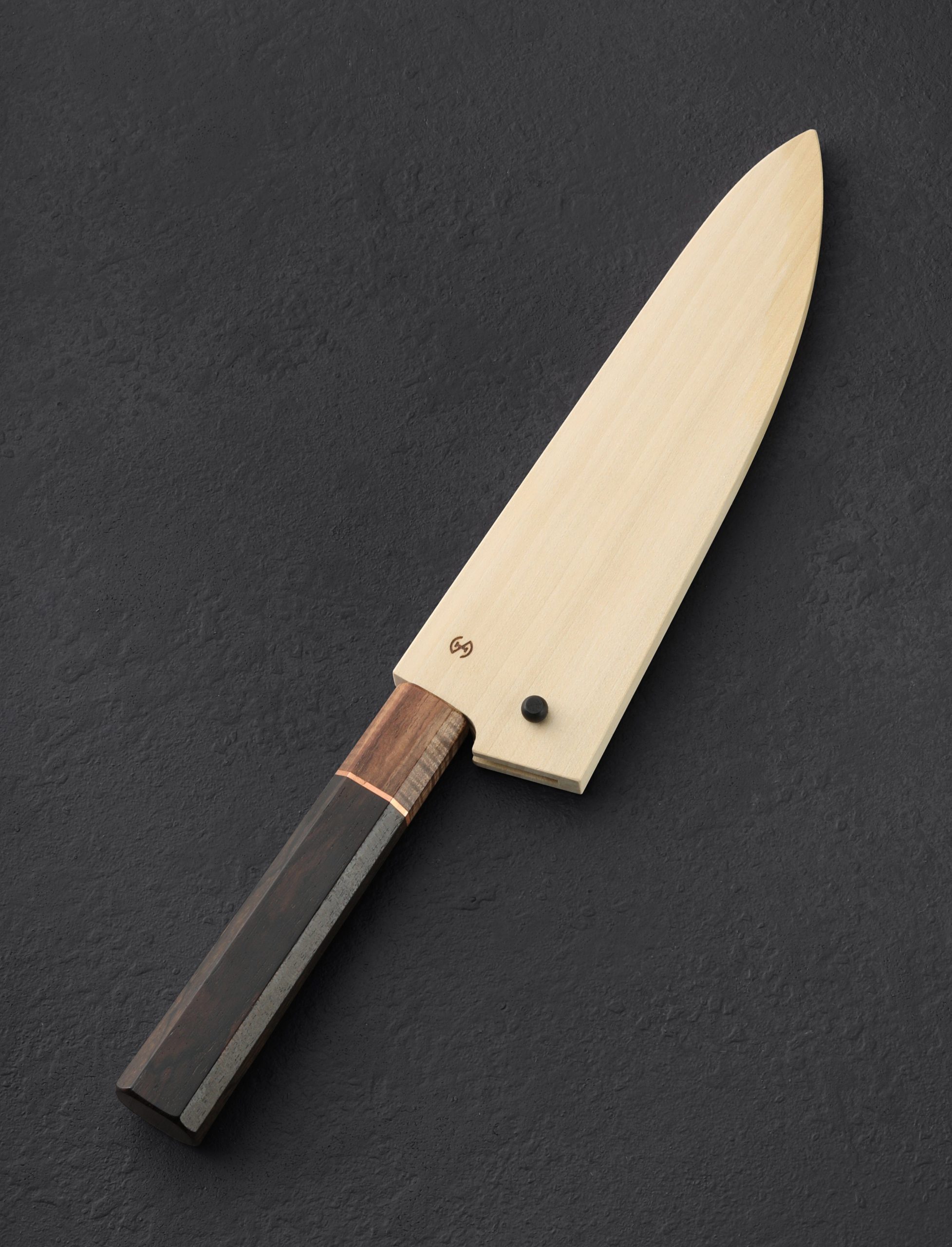 Designed and built for daily use in kitchens large and small, with the nuances and sensibilities you expect from a world-class bladesmith, this 180mm / 7″ chef’s knife from Isaiah Schroeder is versatile, tough, and an absolute pleasure to hold. Balancing just at the blade’s tang in front of the octagonal, wa-style handle, this gyuto delivers the weight and geometry to do it all, from the toughest chops towards the blade’s heel, to the most delicate slices with the extremely thin, tapered, needle-like tip. High performance AEB-L stainless steel is durable and easy to care for, heat-treated in this case to HRC 62.5 for a very hard, sharp edge, with convex, belt-finished bevels below forge-finished flats that show the hammer marks of the knife’s forged origins. For comfort and control Isaiah pairs ziricote with koa wood, separated by a ring of copper, in a long, classic form as comfortable in the pinch-grip as any. A custom poplar saya is included.