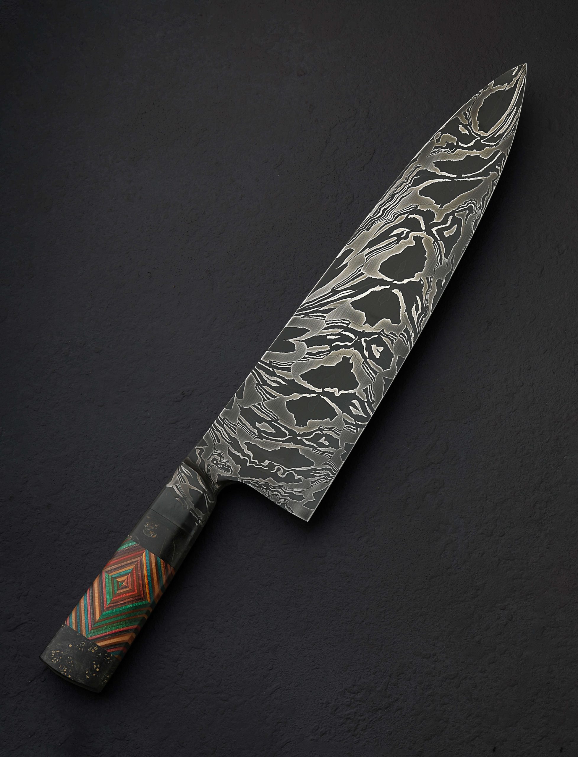 In preowned, unused, pristine condition, Vermont-made combination of materials and styles as only Nick Anger can deliver, this large, bold, one-of-a-kind chef knife pairs a linear, geometric herringbone pattern of colorful, reclaimed skateboard decks with a mind-bending, Rorschach-like damascus pattern of three carbon alloys. For 263mm / 10.4″ the beautifully balanced damascus blade stretches outward from a comfortably sculpted integral bolster, the pattern skewing and bending to the whims of Nick’s hammer blows, a rounded spine tapering steadily from above the 68mm high heel to less than 1mm wide an inch from the tip, providing a touch of lateral flexibility and finesse in the final inches. Compound ‘S-grind’ bevel geometry lends cutting performance to a tool with a thin, hard edge with the weight and versatility of a daily kitchen workhorse. For control, surrounding the herringbone rainbow, black-dyed and stabilized maple is complemented by a ring of black micarta in the front, and finished with what has become Nick’s de facto maker’s mark, a striking damascus ‘A’ in the form of the handle’s retention bolt fastener.