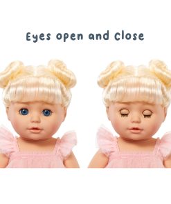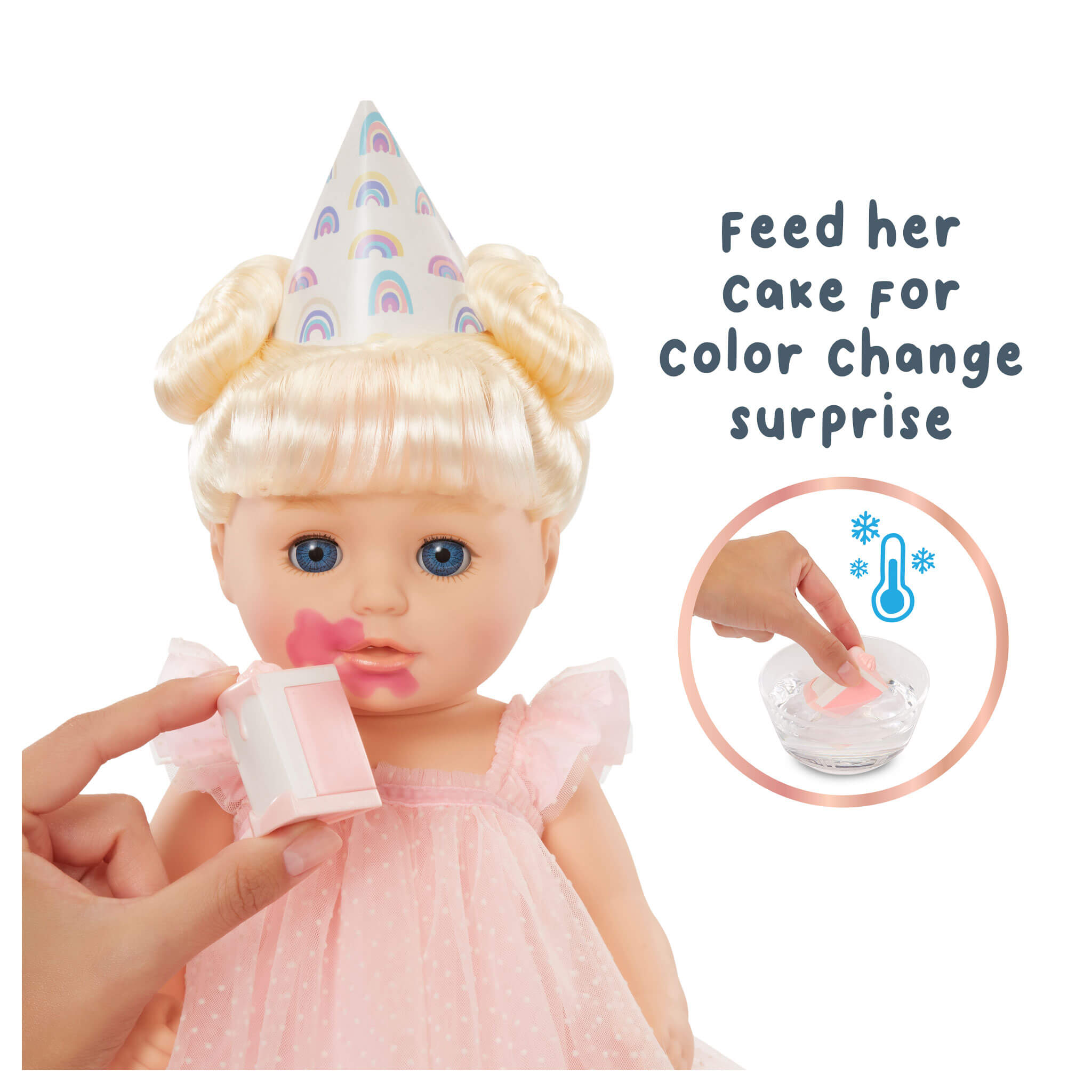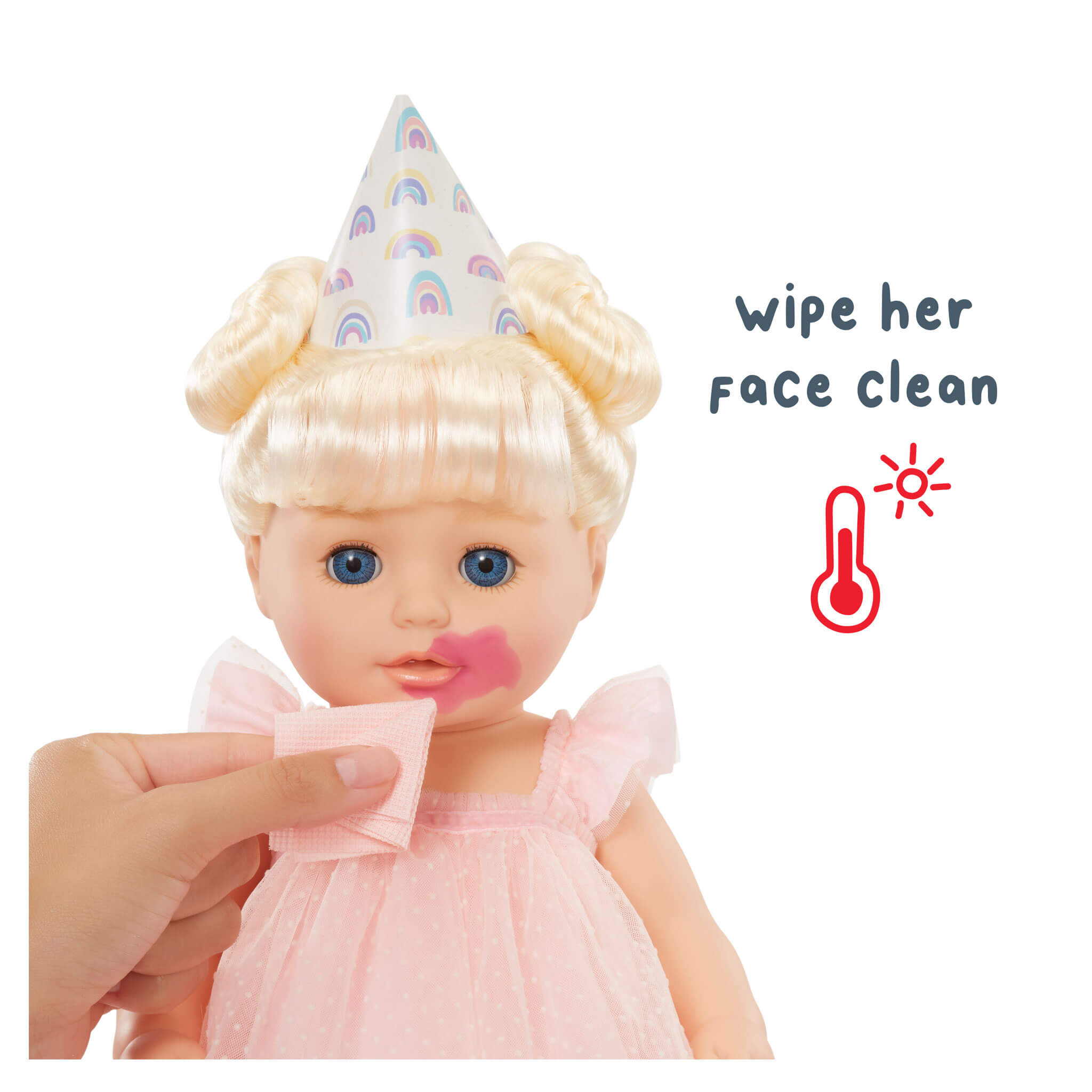 Feed her cake and watch her face go from “clean” to “messy” just like a real baby! To reveal the color change, simply chill the cake slice in the freezer for 30 minutes, then press it to her lips and cheeks—it’s magic in action! When the party’s over, dip the included cloth napkin in warm water to wipe her face clean. After a day of festivities, your little one can lay her down for a nap and watch her eyes gently close. With beautiful, rooted hair styled in adorable top knots, this doll is sure to delight.