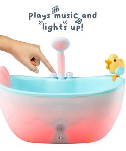 It plays music, lights up and features a motorized showerhead that sprays water. No pumping required! For use with dolls designed for water play. Doll not included. Includes a toy rubber duck that squirts water and a heart-shaped neck pillow. This bathtub is thoughtfully designed using premium materials for a sturdy, modern look.