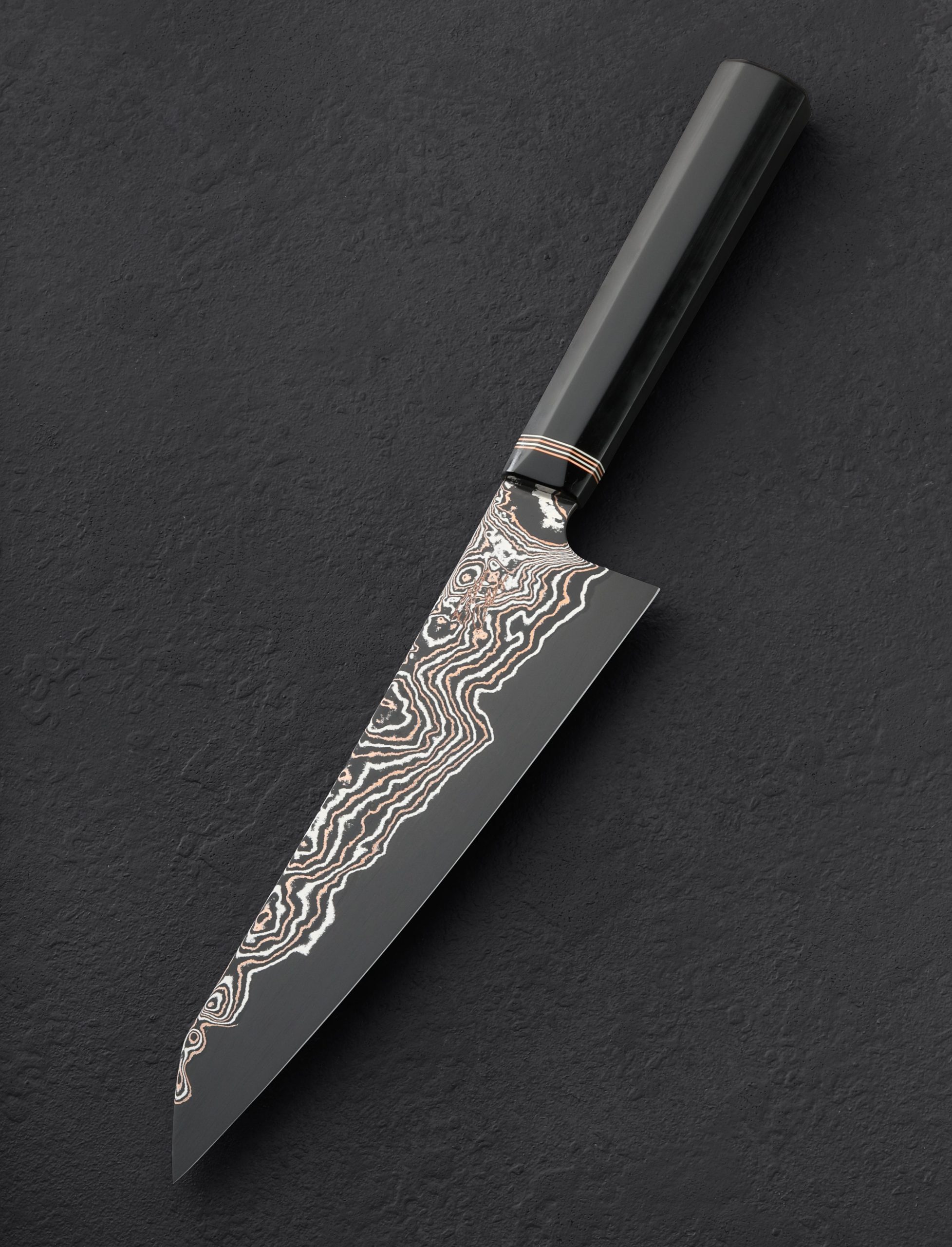 Copper and nickel highlight both blade and handle of this extraordinary chef knife hand-made by a new addition to the Eatingtools family, Dan Tompkins of Evolution Cutlery. At his New York studio Dan has employed the stunning Baker Forge CopperMai steel, a formula that combines copper, nickel, and 1084 in the cladding that jackets a core of 80crv2 carbon steel. But it’s not all sharp looks and premium ingredients: Dan’s geometry and balance are superb as well, this 210mm / 8.3″ gyuto profile delivering a hard, sharp, and thin edge beneath tall, slightly convex bevels with a high-polished finish for cutting performance. A gentle curve allows the knife to rock nicely on the board while a fine, needle-like tip at the end of the blade spine’s full distal taper sits low and perfectly positioned for detail work and precision slices. Balanced just at the front of the handle the blade moves easily and nimbly in the hand, light like a laser with ample strength and lateral stiffness to handle every cut in the kitchen. Matching the blade perfectly is an octagonal wa-style handle of black Richlite, a tough, sustainable, paper-based material with wonderful details, and a series of copper and nickel silver spacers from which we cannot seem to look away.