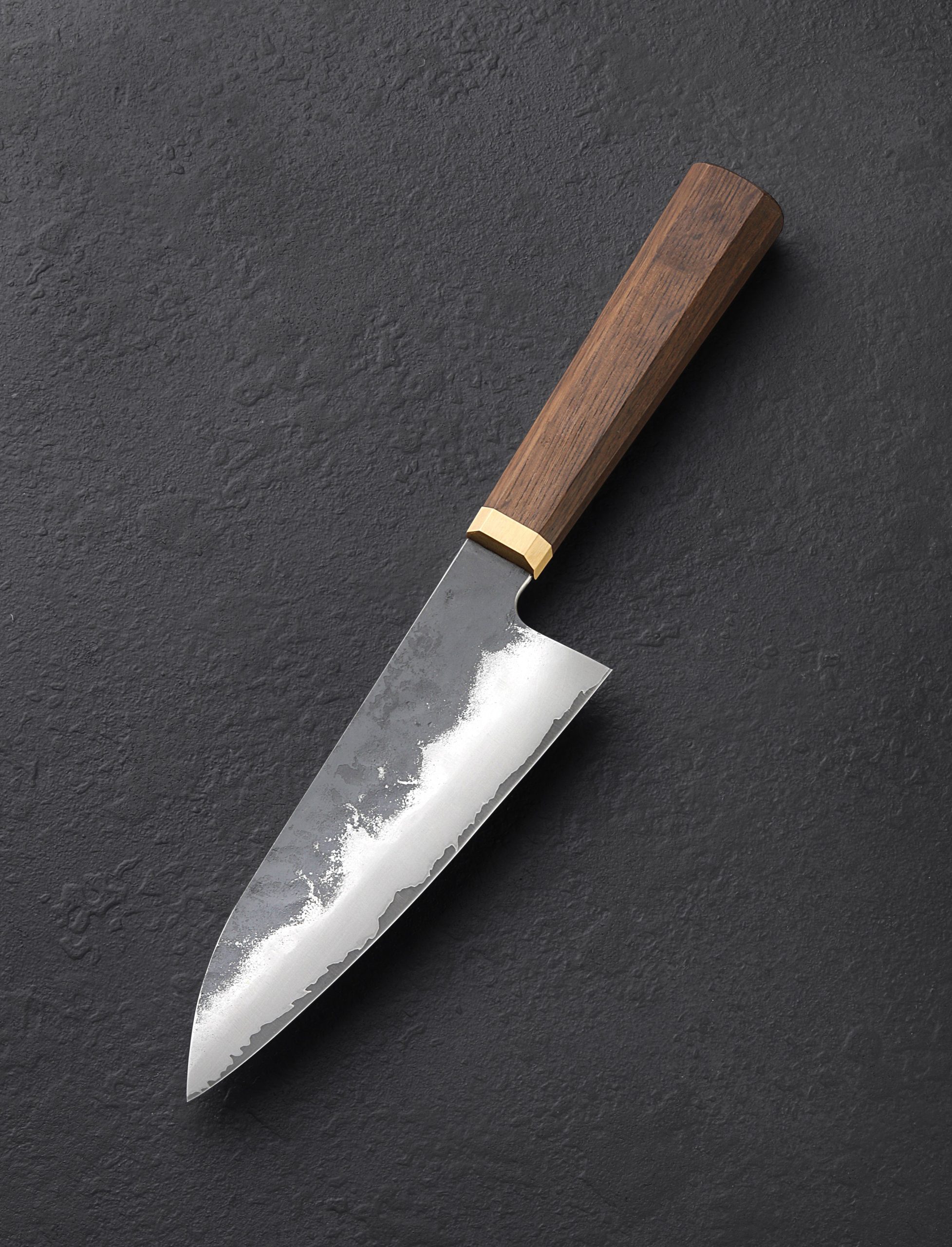 From the Blenheim Forge Stainless Clad collection, a tall, versatile funayuki chef’s knife with Aogami Blue carbon steel cutting edge below a thin layer of pure nickel. The blade profile, with low, slim tip combined with the ability to rock well on the board in a compact 170mm / 6.7″ size, was originally designed as a multi-purpose knife for use on fishing boats, resulting in an outstanding go-to knife for a wide variety of daily meal prep. The fumed oak handle with solid brass ferrule in octagonal, wa style, is just the right length for any preferred grip, and is finished beautifully, comfortable and rounded at the edges.