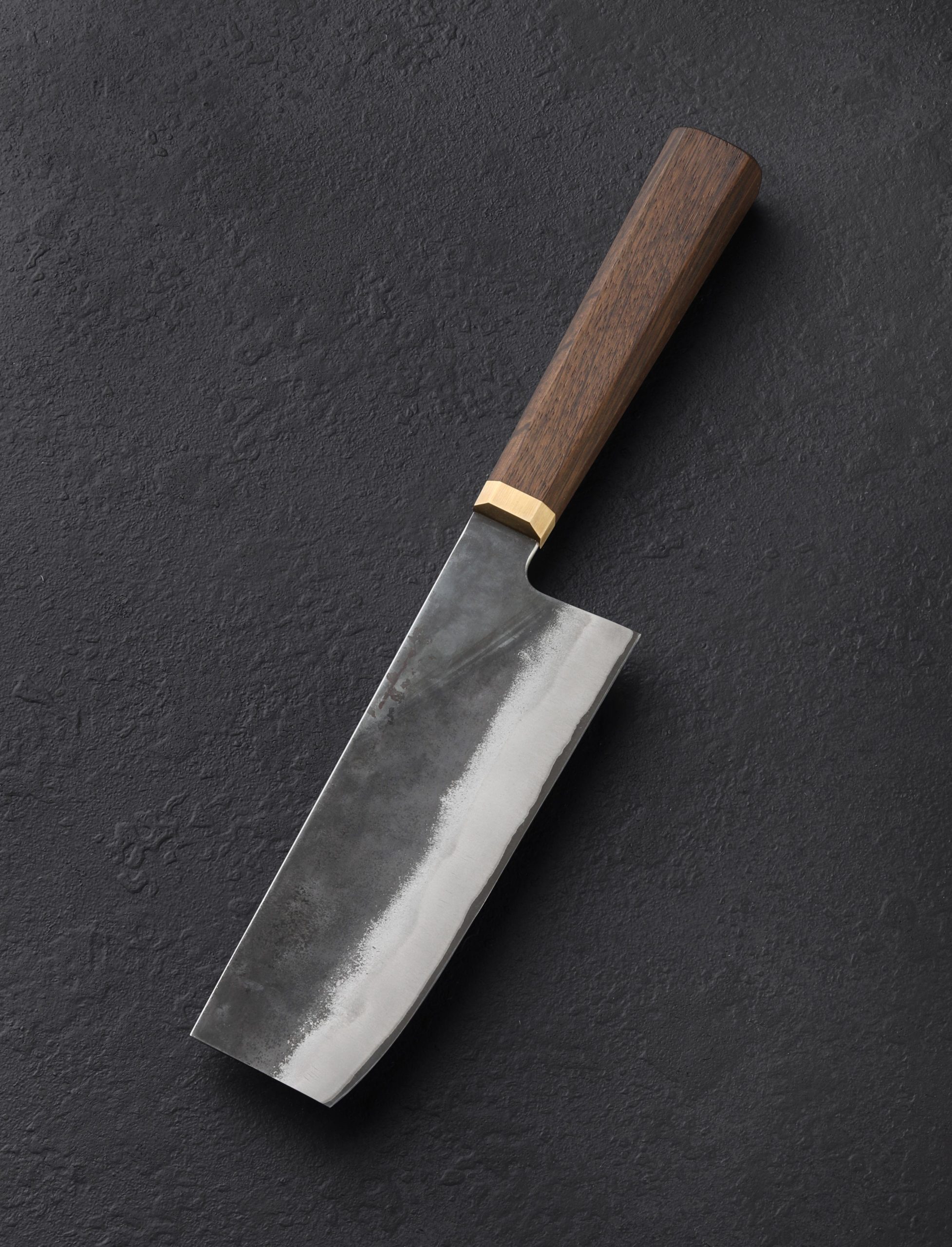 The newest addition to Blenheim Forge’s Stainless-clad chef knife collection is this hand-forged, 165mm / 6.5″ nakiri. A classic Japanese vegetable knife, and one of the most popular all-around knife styles in any kitchen, the nakiri features a relatively straight edge, tall profile, and flat front, designed for efficient vegetable chopping on the cutting board. The edge is thin, hard, and razor-sharp, formed from Aogami Blue Super carbon steel, and clad in jackets of stainless steel, un-reactive for easy case, with a beautiful forged finish. The handle is comfortable and elegant, the fumed oak tapering toward the solid brass ferrule in octagonal figure. An efficient and rewarding tool for home and working kitchens alike.