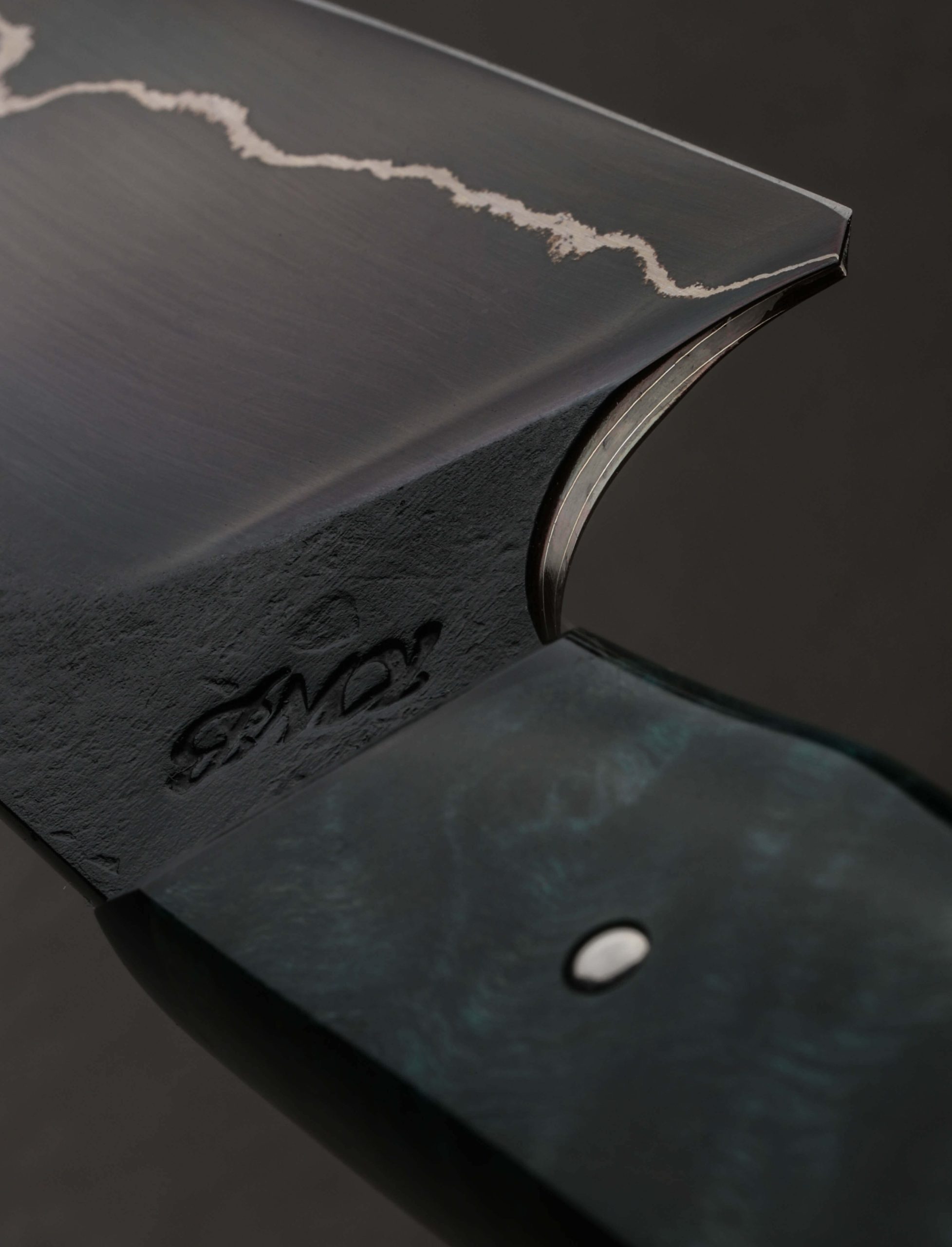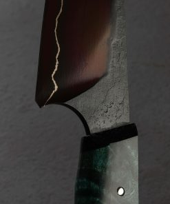 By Korben Bloomfield comes another outstanding piece of kitchen cutlery, available in like new, unused, pre-owned condition. The 157mm / 6.2″ blade is sharp, tough, and versatile, delivering a heel tall and sturdy enough for the most demanding cuts, while the spine tapers to a very fine, needle-like tip perfect for detail work and exacting slices. The blade’s convex bevels drop downward from the forge-finished flats and tang, baring Korben’s darkened ‘special black’ finish including ‘oil spill’ coloring of purples, reds, and turquoise, the result of a careful and purposeful etch and controlled oxidation process. A vein of pure nickel adds to the striking visual effect. For ergonomic control over this one-of-a-kind tool is a handle sculpted from stabilized maple, capped with a ferrule of black G10, and secured with a polished, domed steel pin which allows for handle removal in the case that care or maintenance are needed.