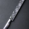 A more exquisite bread knife is not often witnessed. Australian damascus artist and ABS Master Bladesmith Jackson Rumble has forged a 267mm blade from his stunning interpretation of feather patterned steel to created a one-of-a-kind tool for the home and working kitchen alike. Razor-sharp serrations span the length of the thin, lightweight blade, sans the final inch nearing the tip in order to provide the versatility afforded by a short stretch of traditional, straight edge. For the baker’s cutting board, the pasty shop’s counter, or a home cook’s workspace with no shortage of uses for serrations, the remarkable, high-contrast metallic artwork that courses through this object in which nickel-rich carbon alloys retain a bright sheen atop a background of darkly etched tool steel, is both inspiring and invigorating. For comfort and control, whether slicing sourdough, quartering a baguette sandwich, or readying bagels for a schmear, Jackson finishes the build with a simple, elegant handle of ancient bog oak fitted with a polished, stainless steel ring, all sculpted into a classic, octagonal wa form.
