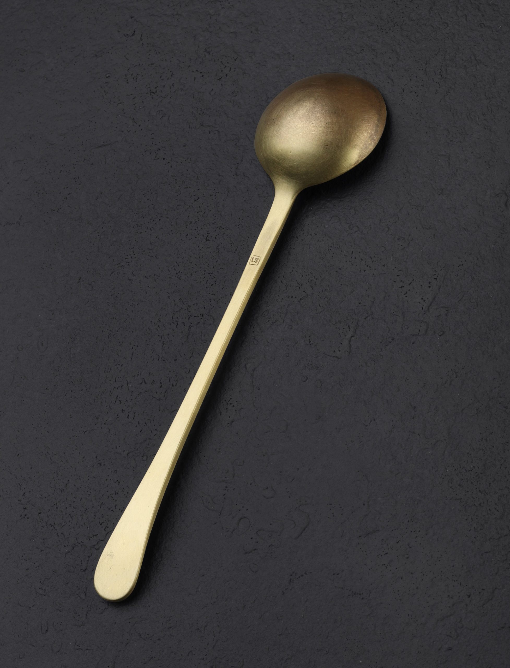 Perfect for serving jams and olives, remoulade and caviar, and anything in between, Erica Moody has created a simple and elegantly beautiful serving spoon formed from solid brass, pairing perfectly with her Brass Serving Knife. The weight of the brass and curves of the design provide and warm and inviting feeling in the hand, balanced perfectly and uncompromisingly handy in the kitchen or at the dining table. The brushed brass will develop a beautiful natural patina over time. An excellent gift for any host or chef on your list.