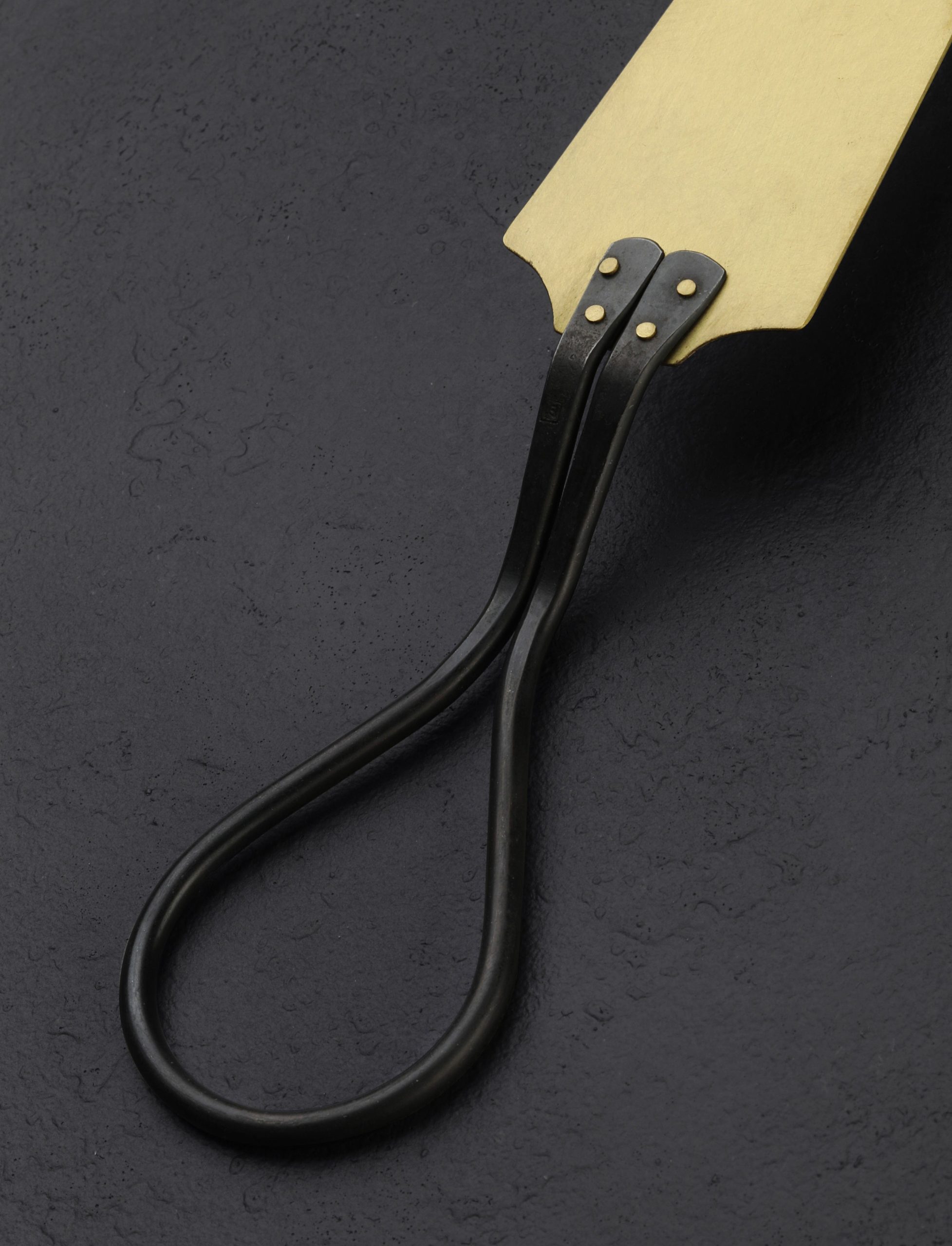 Metalworker Erica Moody designed and made the first Brass & Steel Pie Server the night before a friend’s recent birthday. The resulting form, “the simple plane of the brass with the curved line of the steel leaving and returning to it,” immediately brought back memories of her great-grandmother cooking with beautiful old tools in rural Kentucky…. And the Brass & Steel Pie Server was born. The thin brass blade is riveted with brass pins to a hand forged steel handle, seasoned like a cast iron pan would be for durability. The blade has just the right amount of flex while being sturdy enough for the hardiest of pies. Rustic yet modern, another beautiful kitchen tool from Erica Moody that makes a wonderful gift for your favorite host, or yourself.