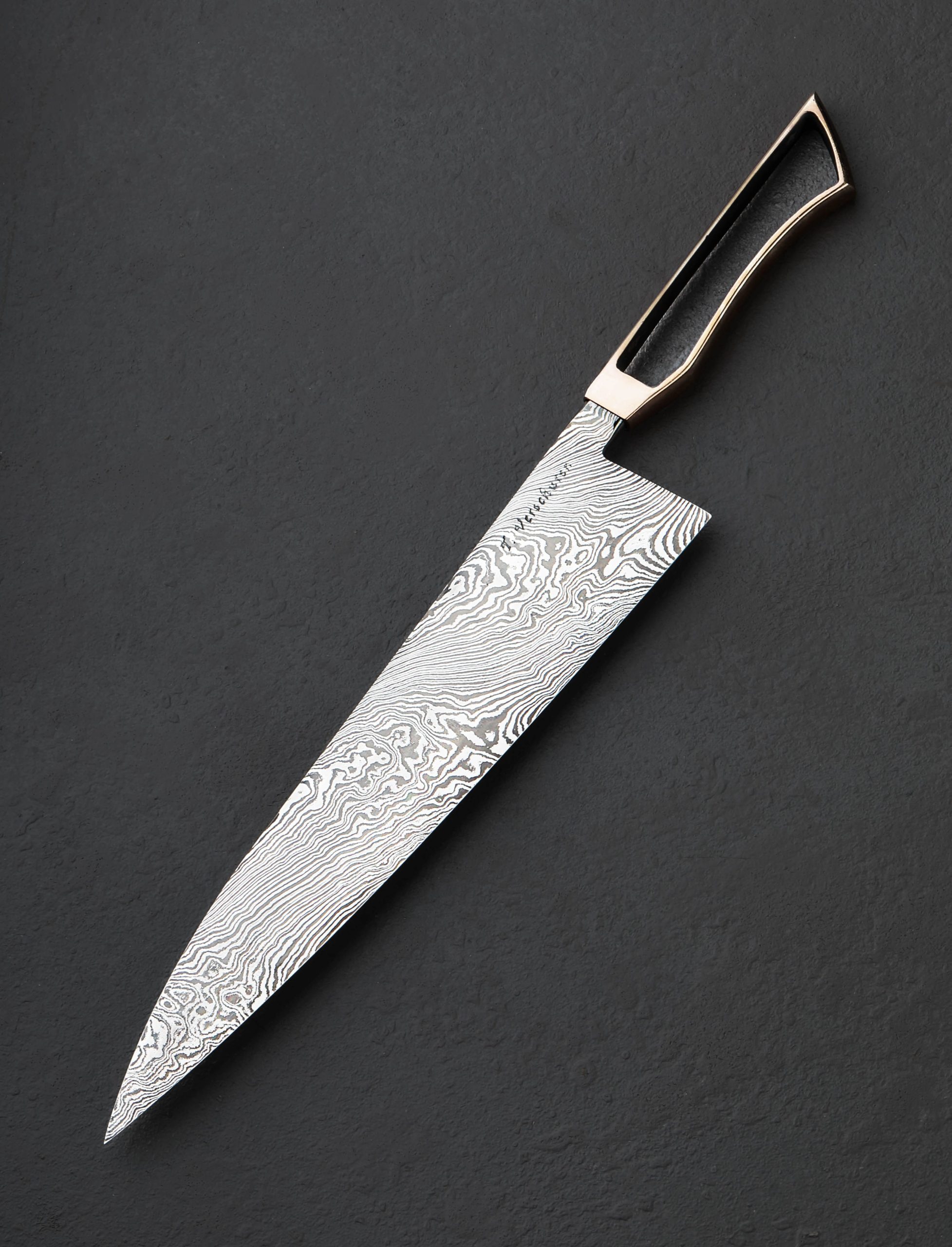 This first chef’s knife by our newest, and youngest bladesmith, Timo Verschuren of the Netherlands, bares the hallmarks of a culinary tool crafted by as talented, experienced, and thoughtful an artisan as we know. Designed and made by hand at his one-person studio, Timo creates a dynamic, high-performance object built for the demands of the hardworking kitchen, and styled with a simple elegance that sets it apart from the crowd. Forged from a house-made carbon damascus steel of his formulation, the blade features outstanding convex bevel geometry which slims downward to a thin, razor-sharp edge. From a wide, stiff, 4.1mm above the heel, the blade’s rounded spine enjoys a superb full-distal taper that slims to 2.1mm at the center to bare 0.7mm an inch from the tip, further adding to the knife’s capabilities around the kitchen; its tough, sturdy geometry toward the rear is perfect for chopping tasks and the densest foods, while the forward inches are especially slim from spine to edge, resulting also in a nicely balanced degree of lateral flexibility in the final third of the blade’s length. The entire knife’s center of mass lies less than half an inch in front of the edge’s heel. At the tip, the twisted damascus steel is glass thin, ideal for detail work and precision slicing. Complementing the comfort of the blade’s polished, rounded spine and heel, which the fingers hug in the pinch grip, is a handle as unique and handsome as it is a pleasure to hold. Sculpted from solid bronze, the hollow, one-piece construction is the icing on a cake that already tips the scales in favor of accolades and applause, shaped and finished with the utmost attention to detail.