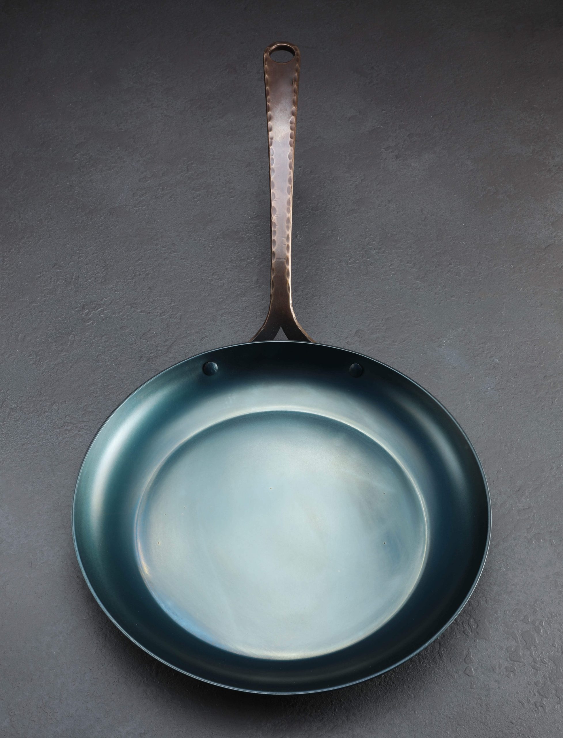The classic, go-to carbon pan of Blanc Creatives handmade cookware collection is the 11″ skillet, with this beautiful version featuring a long, hand-forged bronze handle. With its pre-seasoned 8″ cooking surface and 2″ tall sloping sidewalls, this versatile kitchen tool is a chef’s best friend, ideal for a wide variety of cooking applications whether on the stove top, in the oven, or on the grill over the open flame. Thick, sturdy carbon steel distributes and retains heat wonderfully, and can be used on gas, electric, induction, and glass cooking surfaces. Built by hand in small batches at Corry Blanc’s Virginia workshop, each pan is a piece of unique, functional art.