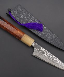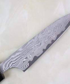 The blade is made with a VG-10 core forged Nickel Damascus Stainless steel (HRc. 62) and features a traditional Japanese Hamaguri-Ba (Convex) blade grind that provides remarkable cutting performance.