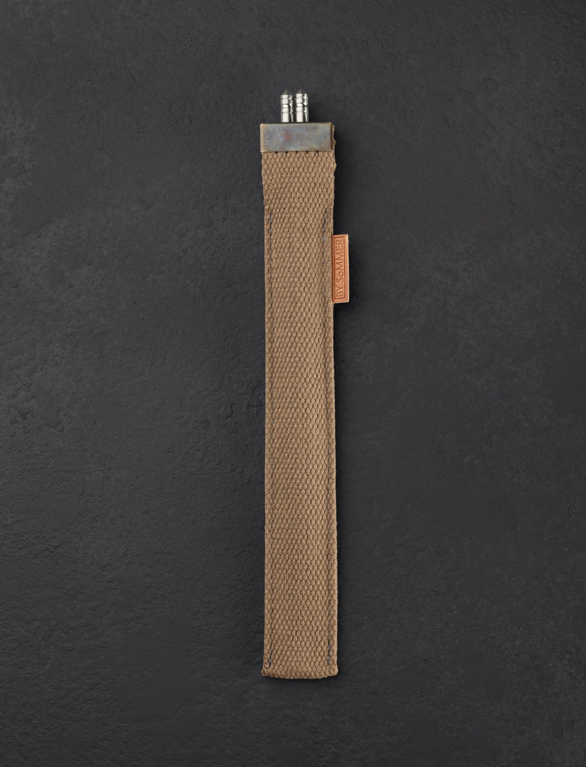 Designed and made by hand in Denmark by Birgitte Sommer especially for our TiStix Titanium Chopsticks, these canvas chopsticks cases are made from reclaimed military straps and topped with a metal cap complete with two eyelets. A simple and elegant leather tab indicating the cases are handcrafted “BY SoMMER” adorns the side of each. Our TiStix chopsticks are 9.375″ long and made from 0.25″ solid titanium and these cases will accept other chopsticks of the same dimensions. *Chopsticks not included.