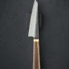 For his latest trick, crafting yet another extraordinary, one-of-a-kind chef knife with unique style as captivating as its utility on the cutting board, this is Cascade by Charlie Ellis. At his former studio in the Blue Ridge Mountains of North Carolina, Charlie combined three distinct carbon steel alloys, 1084, 8670, and 15n20 to create a striking, three-tone damascus pattern that seems to cascade over the edges of the integral bolster, down the length of the blade, and out through the tip. As impressive as the damascus itself is the function-first geometry of the tool it forms: Charlie’s compound ‘S-grind’ bevel geometry is well-loved and always meticulous, the concave portion beginning just in from the blade’s choil and then dissipating gently as it nears the tip, all above a superbly shaped convex stretch that culminates at a very thin, very sharp, near-zero edge. The spine of the blade, with its three-faced faceted profile, tapers steadily forward to a fine, pointed tip while maintaining rigidity throughout. Exceptional fit-and-finish describes every element of the knife’s comfortable, head-turning handle: a tapered, hand-forged integral damascus bolster hugs a carved spacer of ‘Dark Matter’ purple-infused carbon fiber with then meets a carved piece of dyed and stabilized box elder burl. Symmetrical fullers, or hollowed-out element along the left and right faces, extends through all three handle elements. On the rear face is a flush ‘Dark Matter’ carbon fiber retention bolt end cap.