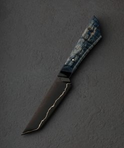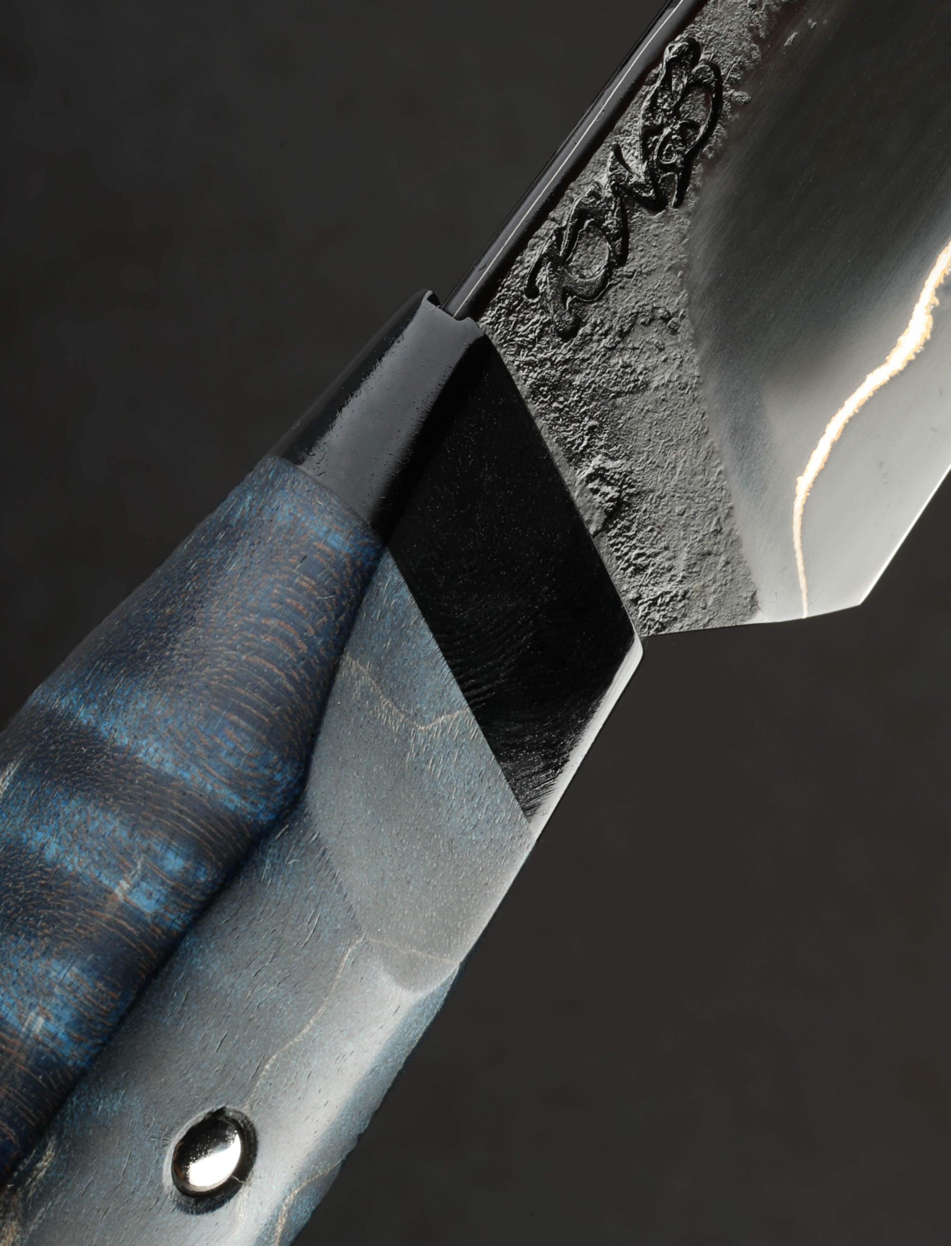 With a sakimaru style tip, often referred to as a tanto, a thin, razor-sharp edge of 80Crv2 carbon steel, and a vein of nickel jacketed by two slim layers of pure copper, Korben Bloomfield crafts a stunning, versatile, and unique blade for the chef’s kitchen. Forged by hand at his studio in England’s south-east, the housemade cu-mai steel bears the marks of its hand-hammered origins along the spine and tang, with convex bevel geometry and a fine, pointed, yet tough tip providing unlimited utility breakfast, lunch, and dinner. Prep and cook with it, and then take this stunning tool to the dining room and use it at the table to dine to the last bite. For comfort and control in a beautiful, ergonomic, hand-filling form is a handle shaped from dyed and stabilized curly maple secured by an heirloom-fit, domed, and polished steel pin and capped with an elegant ferrule of black micarta. The handle has been designed to allow for removal in the case that care or maintenance are needed.