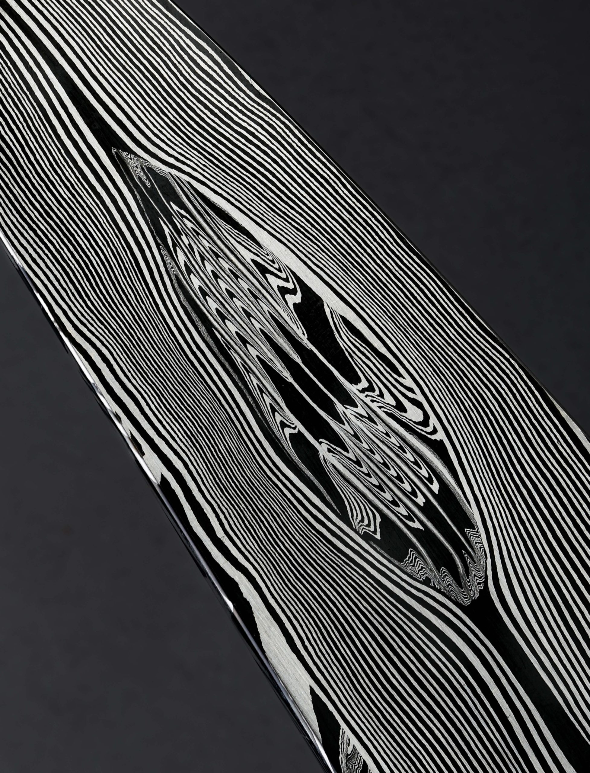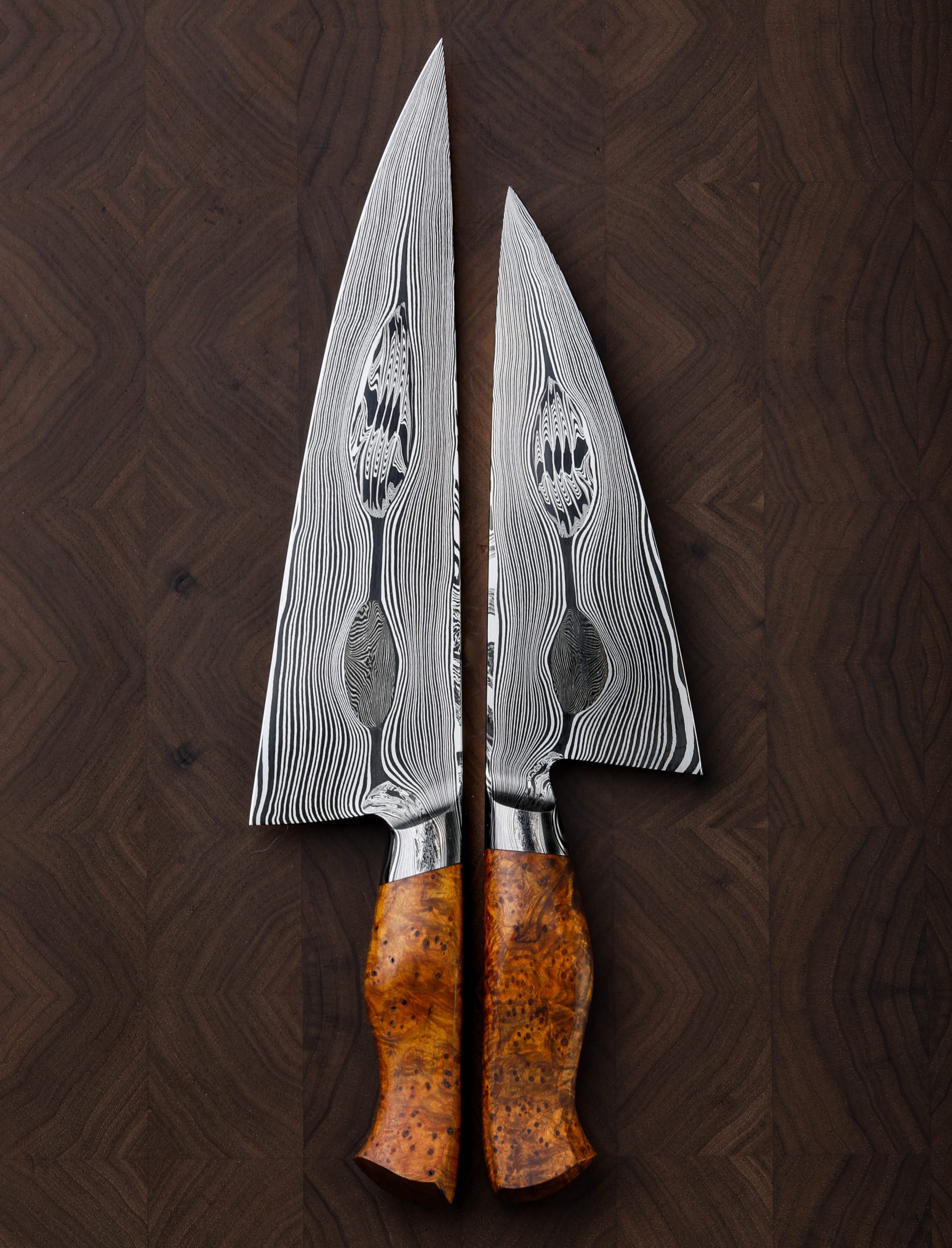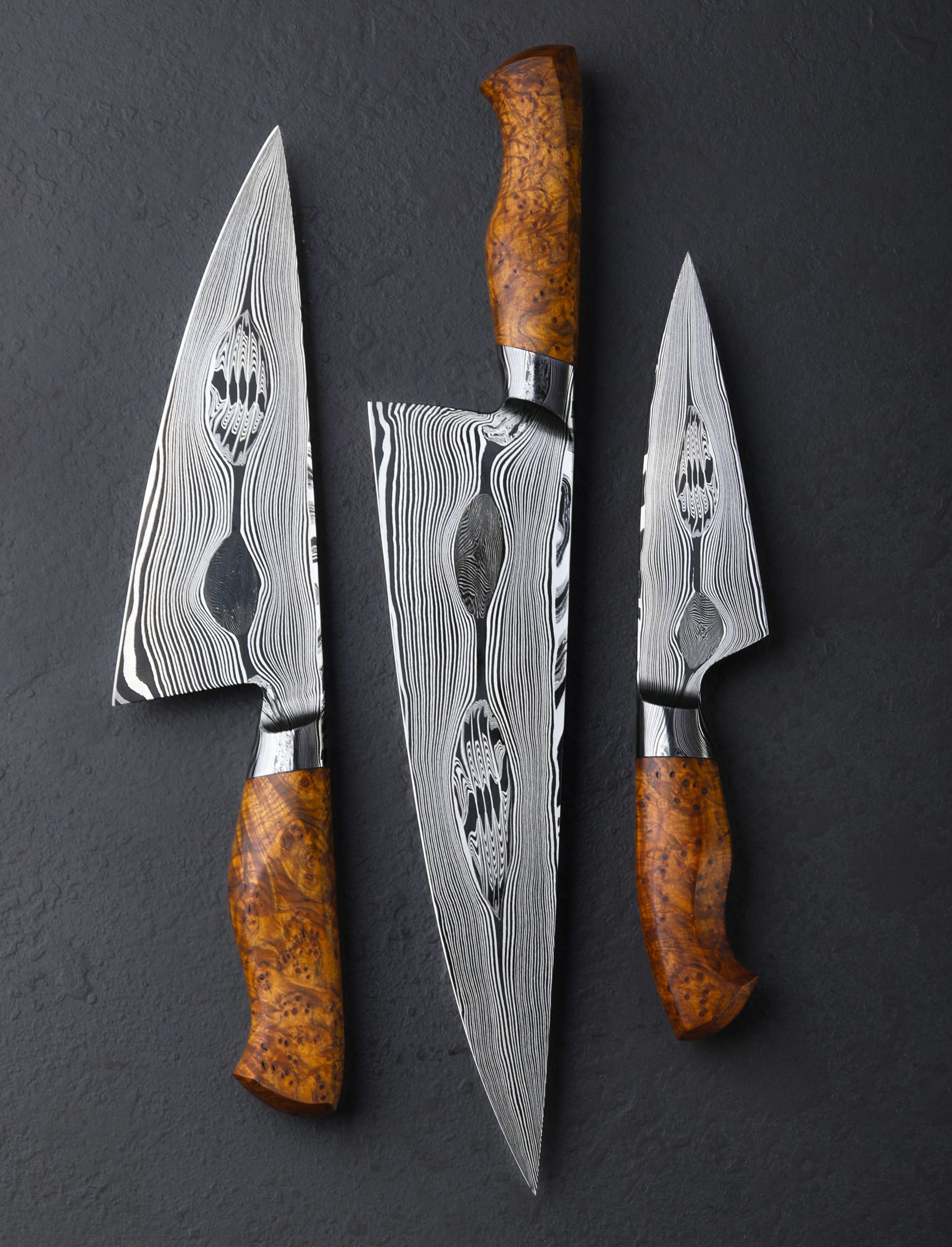 An extraordinary chef’s set by the uniquely talented Rhode Island-based artist and bladesmith Joshua Prince. Designed and handmade exclusively for this set, high-carbon damascus blades and integral bolsters feature dual “plug-weld” mosaics decoratively inserted into a patterned canvas that boasts flowing, parallel bands, lines which appear to converge into one at each blade’s tip. For every cut, every ingredient, and every meal, a chef knife, petty chef, and utility blade combined for uninhibited cooking pleasure. Stiff, tough, hardworking geometry, symmetrical, convex bevels, and slim, razor-sharp edges guarantee precision and performance. Sculpted from the exceedingly rare and stunning hardwood known as chittum burl, found only in a small area of the US South near the Gulf of Mexico, matching, integral bolster handles complete the individual works of culinary art that combine into this one-of-a-kind offering.