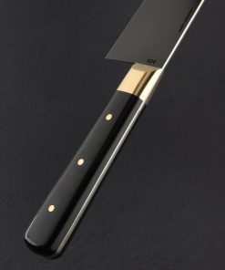 A handcrafted chef knife collaboration between Living Steel and Sweden’s Joel Andersson and Adisa Copra, the talented team behind Andersson Copra, this elegant, French-style knife is built to be the go-to cutting tool for daily meal prep of all variety in home and professional kitchen alike. At 235mm / 9.25″ long and standing 49mm tall at the heel, the blade is sculpted from Swedish Uddelholms UHB20C high-performance carbon steel, tapering steadily to a fine tip for detail work, and delivering a thin, hard, whetstone-sharpened edge beneath superbly shaped convex bevels. The blade receives a forced patina for extra protection and good looks, contrasting the rounded and high-polished spine and choil. Simple in form, wonderfully finished, and comfortable in any grip, the handle of polished black micarta is secured with three solid brass pins and capped with tapered brass bolsters.