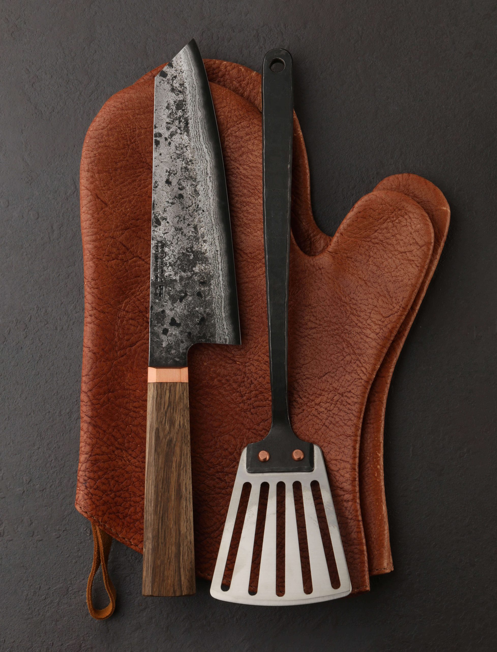 A 3-piece gift set to enhance even the most elegant of kitchens includes a do-all chef’s knife, leather oven mitts, and serving spatula. Each is handmade with precision and care to offer both beauty and function. Soft and comfortable, Linny Kenney’s leather oven mitts are stitched from premium, ethically sourced, vegetable tanned, full-grain leather to provide ample protection while moving hot items around the kitchen, and for working over an open flame outdoors. Blenheim Forge’s Santoku 180mm is forged from carbon san mai with folded iron cladding and a very sharp Japanese Blue Paper steel edge. Balanced and quick in the hand, the knife’s geometry is thin and versatile, the walnut handle fitted with a solid copper ferrule. The Slotted Steel Serving Spatula, handmade by Alex Pole Ironwork, is elegant enough for the dining room and tough enough for the kitchen or grill. This set provides unmatched utility to any kitchen for years to come.