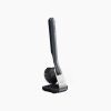 This broom features feathered bristles and a telescopic handle, stored in a Dust-shield™ holder that fully encloses the head to keep storage areas cleaner.