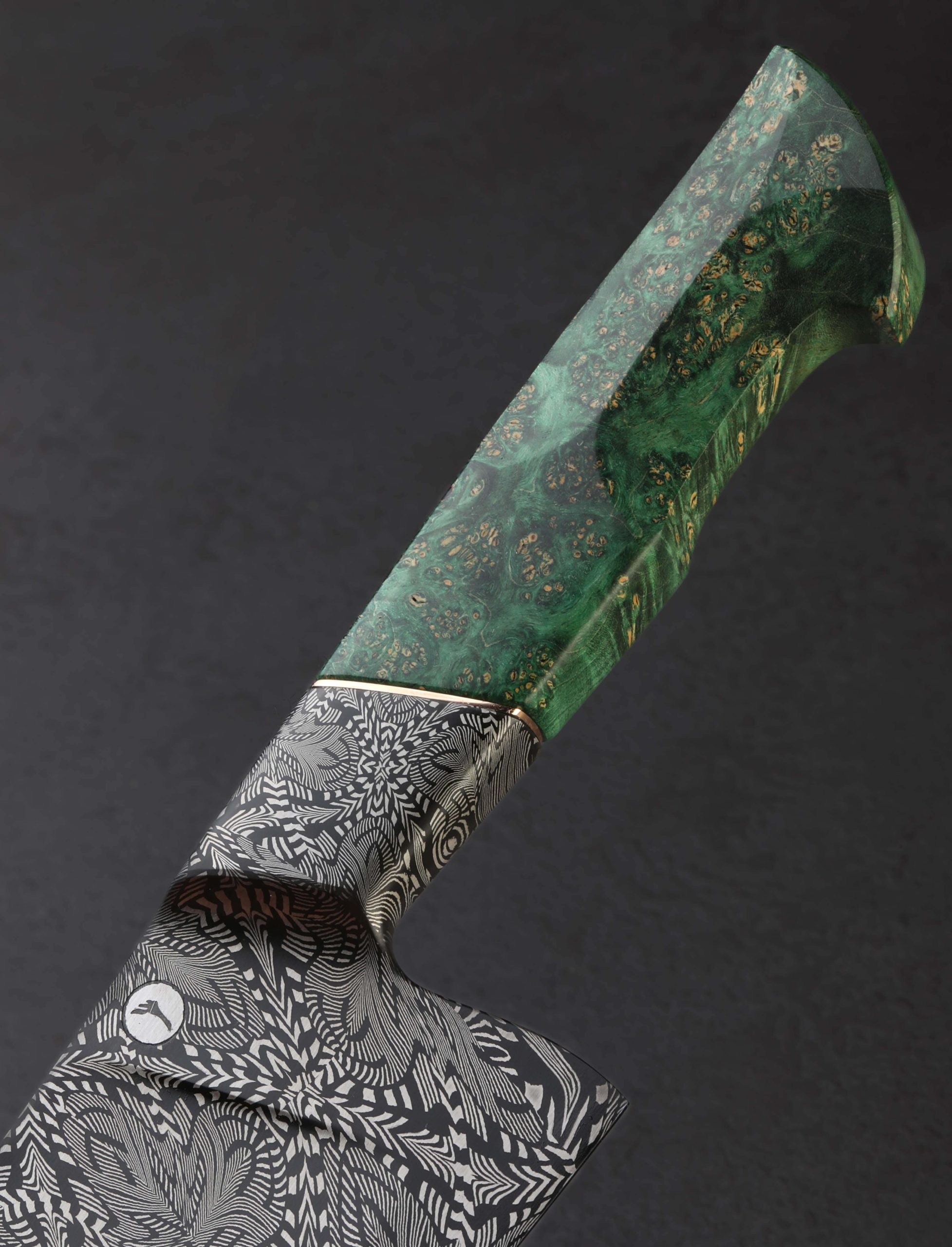 The latest and greatest by one of the best in the business upholds in every way the extraordinary standards he has set for his culinary artwork: by bladesmith Salem Straub, Constrained Vibrations is the freshest chef knife to be cooked up at his Washington studio. The blade, measuring 262mm / 10.3″ long and 63mm tall, is shaped from a newly conceived mosaic damascus pattern that merges dense and open elements, perpendicular and parallel lines, and stretched and condensed forms, which tiled together form a striking and detailed metallic artwork that flows from the integral forged bolster to tip. Light and thin, the entire object weighing under eight ounces, the blade enjoys Salem’s usually superb compound ‘S-grind’ bevel geometry above a thin, hard, razor-sharp edge. The dimensions in tandem with Salem’s carefully calibrated heat-treatment process results in no small degree of lateral flexibility in the forward half of the blade. Tapering steadily along the rounded spine, the blade’s width from top to bottom slims until a fine, pointed, yet not-delicate tip is reached, perfect for all manner of slicing and detail work. Comfort and control are provided by a Western style handle in spalted maple wood with a stunning combination of curved faces and flat facets, set with an heirloom-fit Zildjian Cymbal bronze spacer, and capped with a silicon bronze retention bolt cap at the rear.