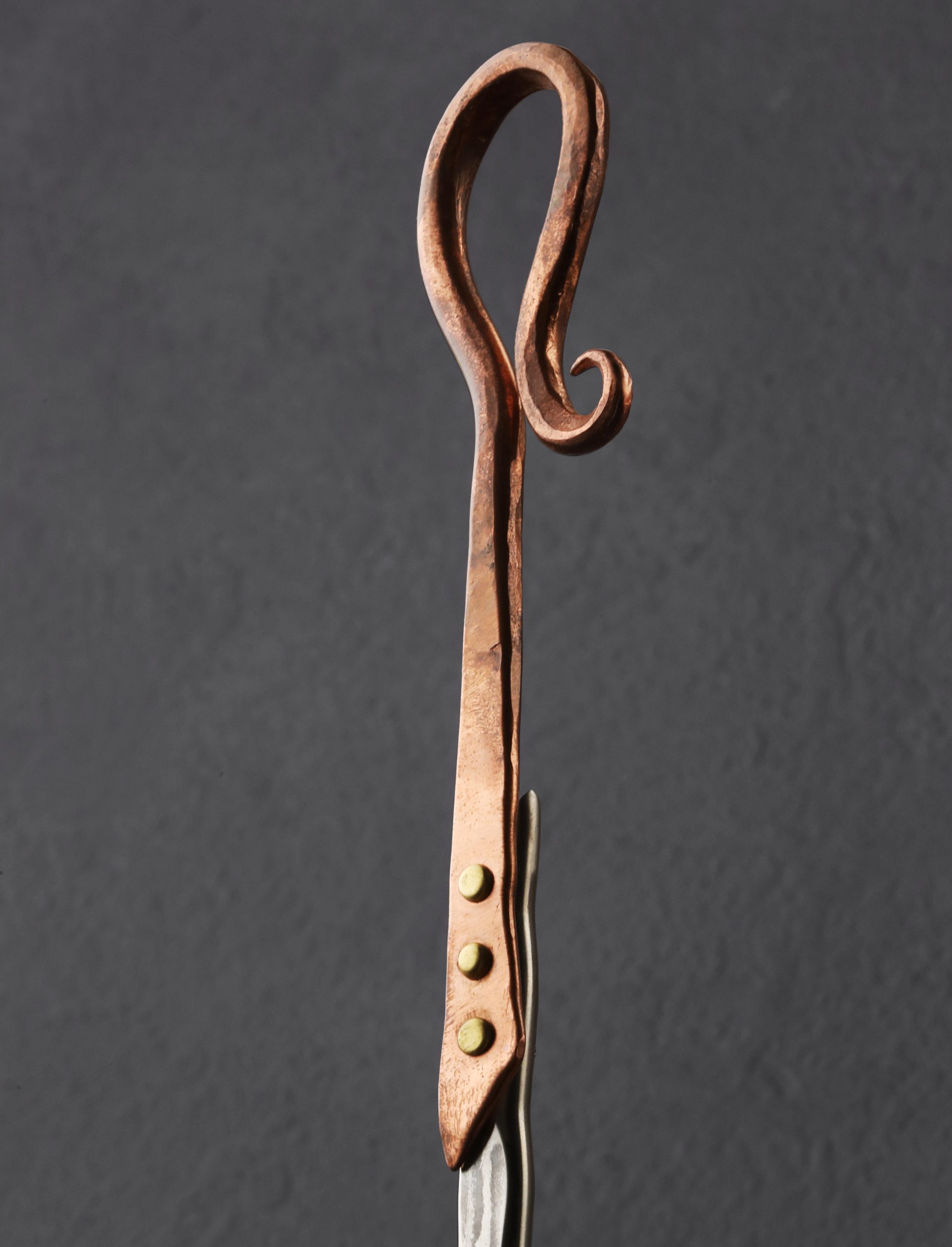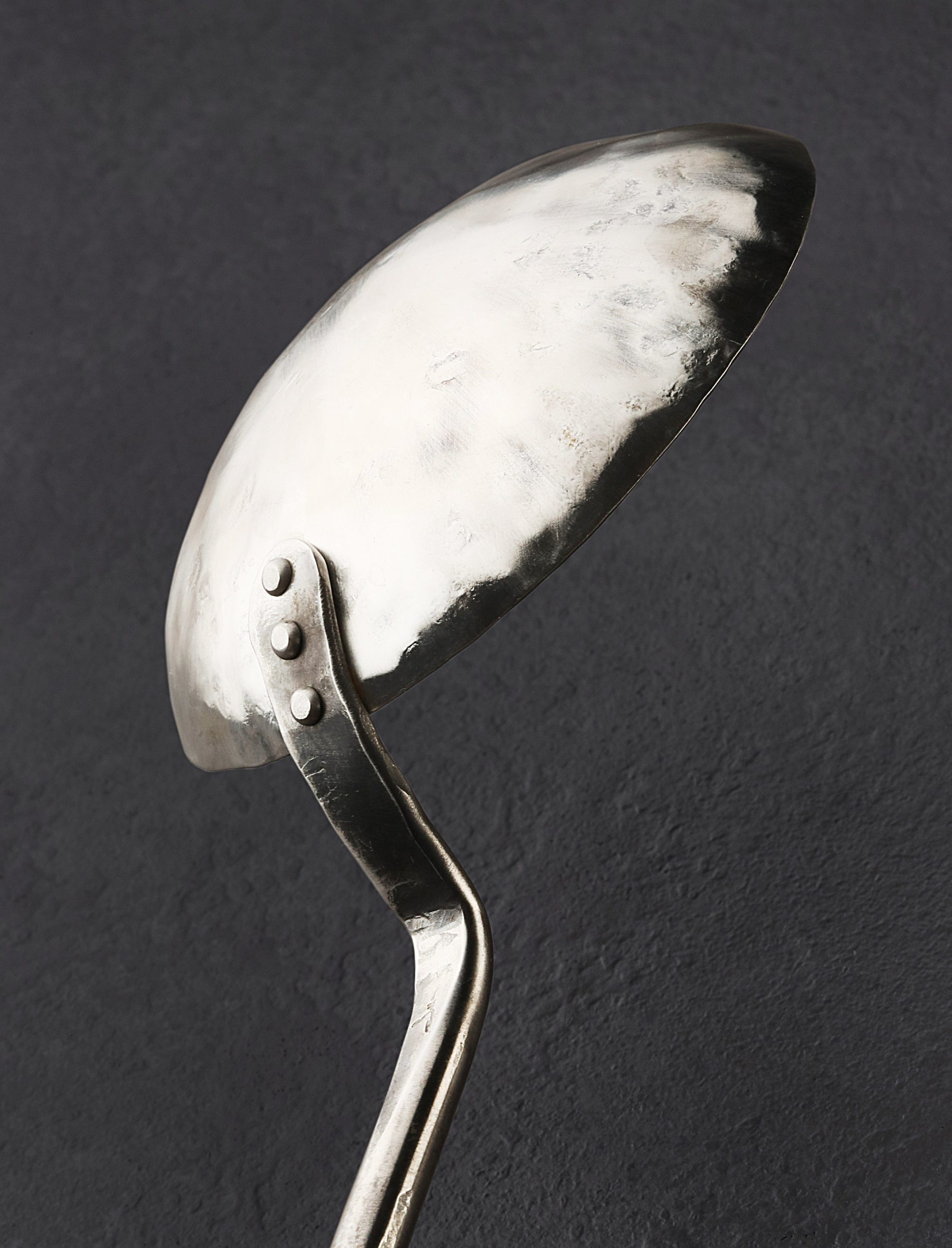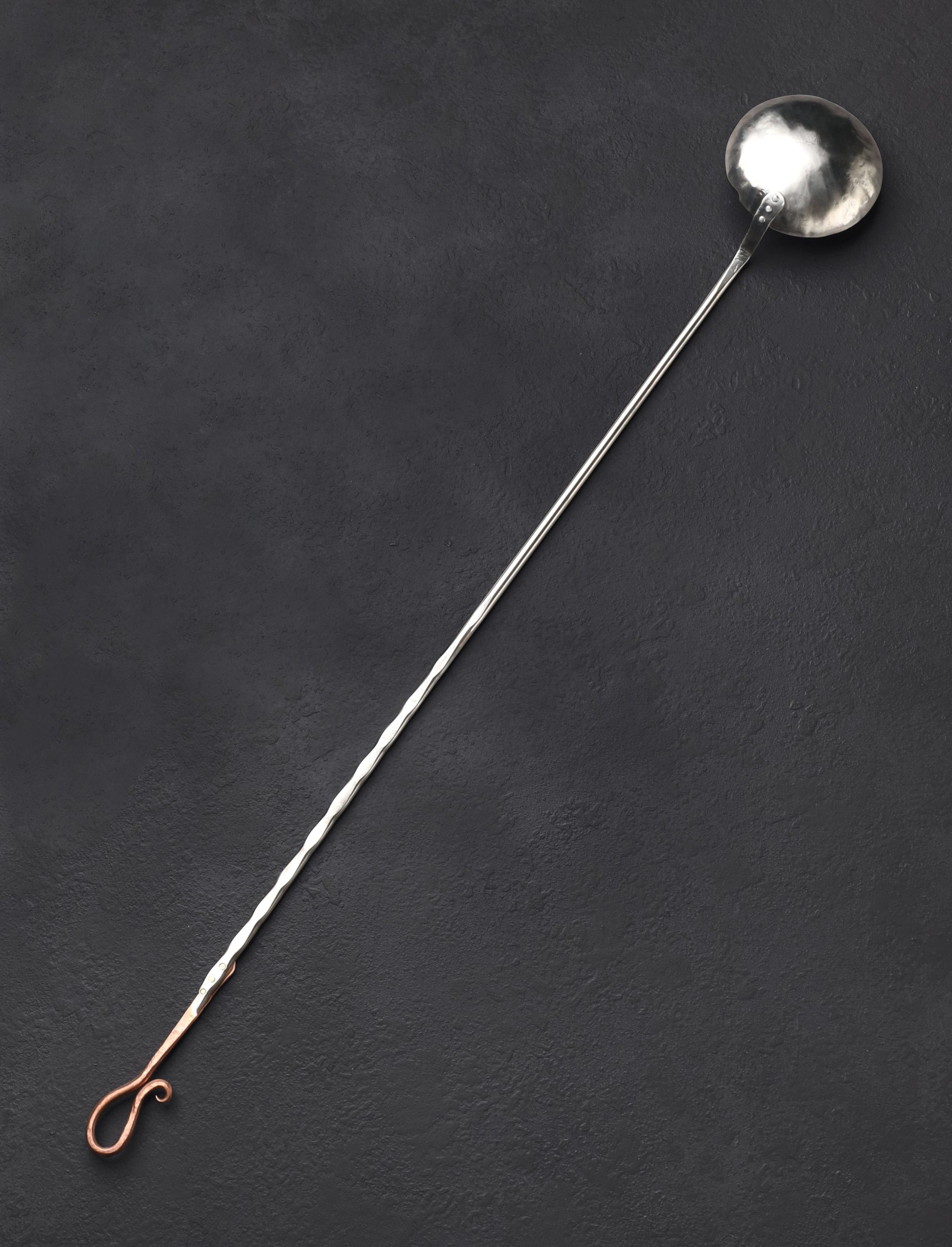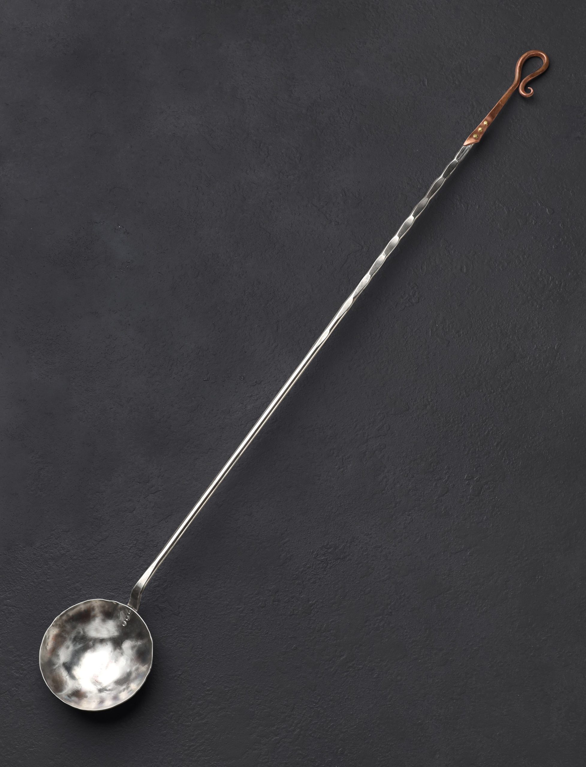Perhaps one of the most unique and niche tools in a chef’s arsenal, the egg spoon provides a raw, agrarian method of preparing this versatile staple: frying atop the coals of a fire. Forged by hand in Colorado by Jill Rikkers, this beautiful object features an extra-long 820mm / 32″ handle for safe handling at the fireplace, hammered and textured for grip, and embellished with a decorative copper end, secured with brass pins, for hanging on the wall. The bowl, finished with a lovely brushed and hammered sheen, is contoured just so for cooking an egg at a time.