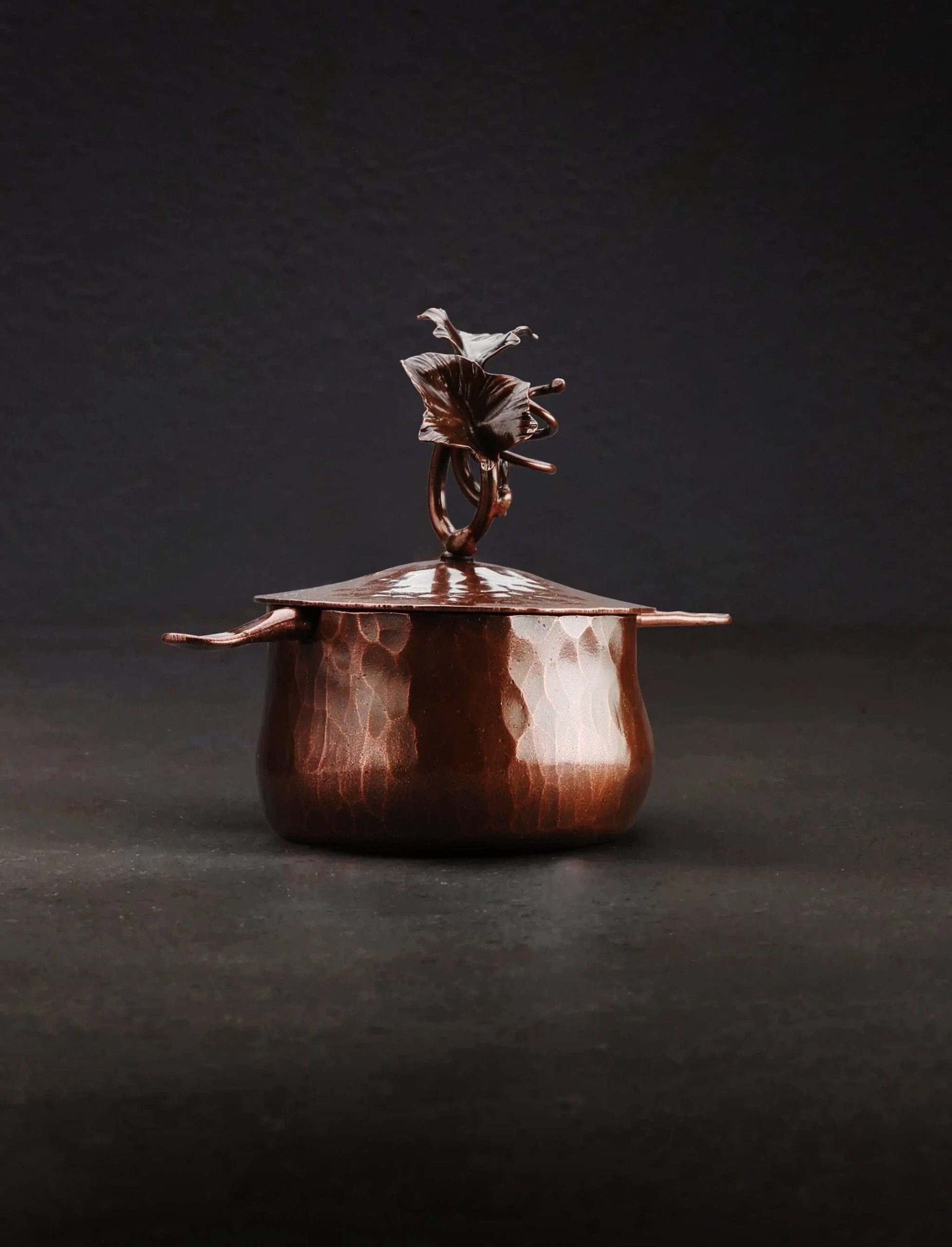 This beautiful, hand-hammered vessel and spoon set complements any interior, whether at home in the dining room to store your preferred finishing salt, or in the kitchen topped off with crystal kosher salt. Part copper sculpture and part culinary tool, husband-wife team Rex and Marsha Morton of Mountain Metalsmiths show off their many talents, the results of their combined decades of coppersmithing experience, in this piece of functional art. Three pieces of art, to be precise: The cellar itself boasts elegant, contoured walls that flare outward toward the base, a notch at the rim in which the spoon rests, and a small post with which to receive the lid. The elegant, domed lid, also bearing the hammer marks of the object’s hand-hewn origins, is capped with a decorative Vine handle, giving each a one-of-a-kind adornment. Made removeable to use the cellar with or without it, the lid includes a hole to receive the post built into the cellar so that it can easily opened and closed. Finally, a handsome and simple salt spoon, also forged from solid copper, completes the three-piece set. Each is sealed with a food-safe varnish for longevity.