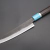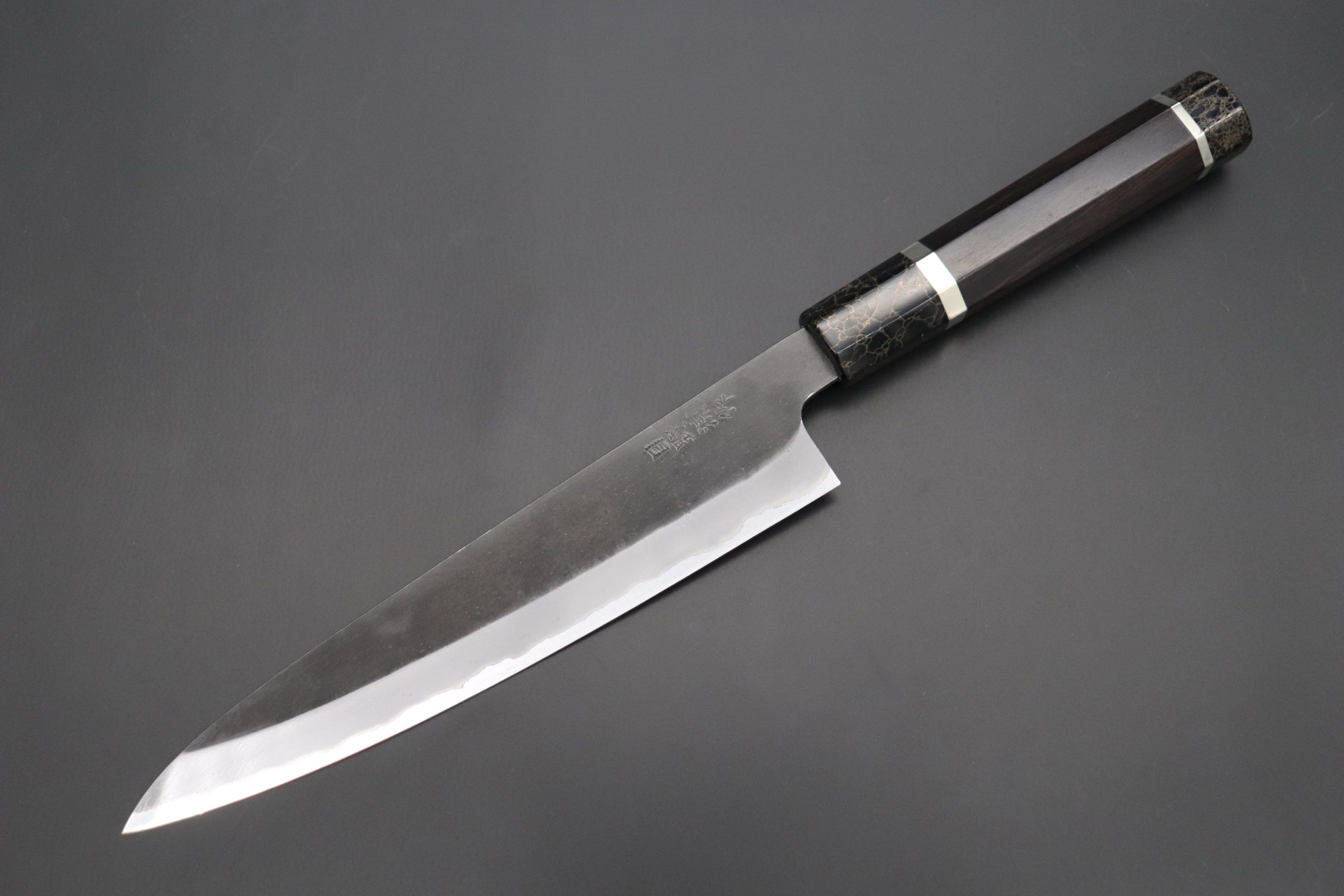 This is the Custom Limited Edition Special Knife Collection. Beautifully polished and finished, Hinoura’s natural gradation color and taste of the modern & traditional Kurouchi Wa Gyuto Knife is fitted a with a Innovative Octagonal Ebonywood Handle with Nickel Silver Spacers and a Black-Golden- Color Turquoise Composite Stone Ferrule & Butt. Please feel the harmony of the traditional historical art and modern, high-sense design, quality.