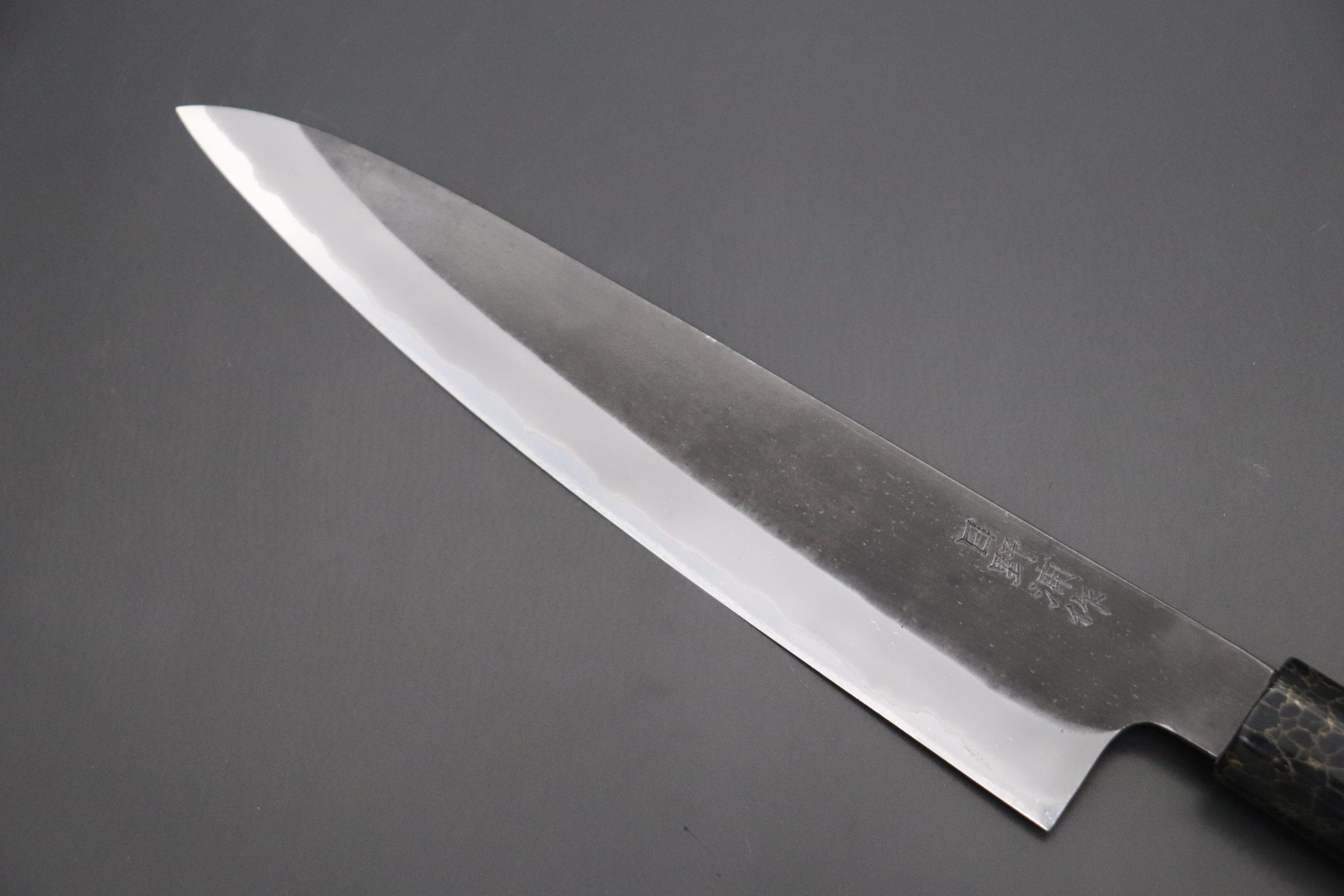 Although some people consider Master Honoura’s knives to be thick and heavy, their geometry is the result of carefully considering every aspect of their function. Contrary to what you might expect, the process of forging a thick blade ‘to shape’ actually requires a lot of time and skill. Master Honoura’s knives are nicely tapered from their heel to the tip and from their spine down to the cutting edge, which is ground very thin behind the edge. We are confident that these knives will provide the high cutting performance that is demanded by Carbon steel lovers!