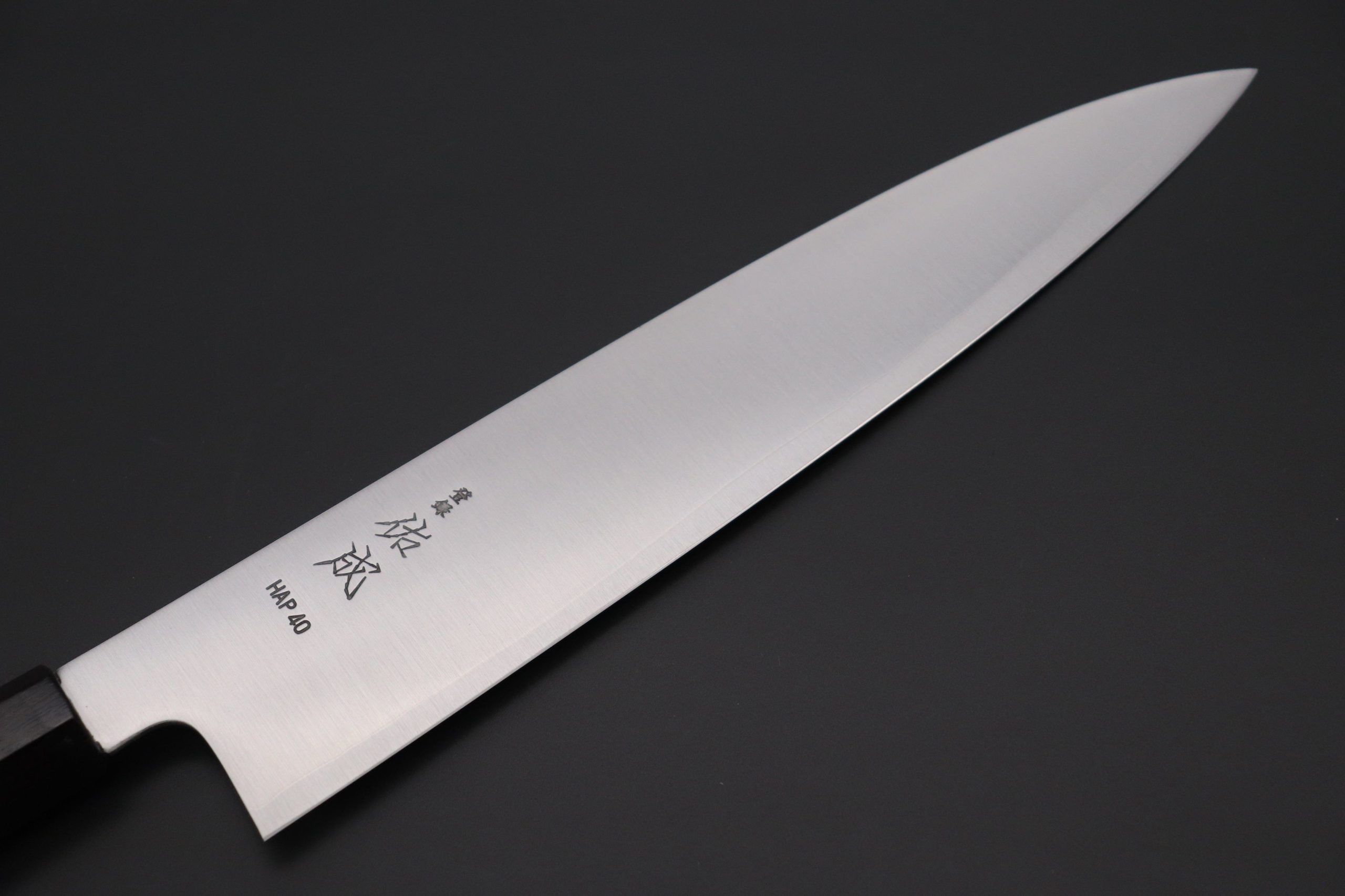 Sukenari’s knowledge of traditional forging processes and their extensive experience with modern, high performance, steels proved to be invaluable while perfecting these new HAP-40 knives. Master Hanaki, Sukenari’s innovative and energetic knife maker and Master forge-smith, has successfully managed to extract the best cutting performance and edge retention from these HAP-40 knives (HRc. 68). They are perfect for customers who love testing exotic hi-tech steels, or those who appreciate knives with outstanding cutting performance and edge retention.