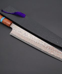 This Custom Limited Edition Sukenari HAP-40 Clad Wa Sujihiki knife is fitted with a Innovative Octagonal Bubinga Burl Wood Handle with Marble Color Water Buffalo Horn Ferrule and Composite Turquoise Gemstone Ring and Nickel Silver Spacers. A matching Black Lacquered wood Saya (Sheath) with a black pakkawood Saya pin is also included with the knife.
