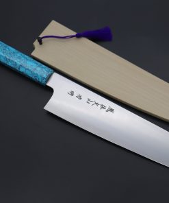 This Custom Limited Edition Sukenari HAP-40 Nickel Damascus Kiritsuke 210mm knife is fitted with a Innovative Octagonal Bubinga Burl Wood Handle with Composite Black Color Turquoise Gemstone Ring and Nickel Silver Spacers. For safekeeping, this knife comes with a matching Magnolia wood Saya (Sheath) with a black pakkawood Saya pin.