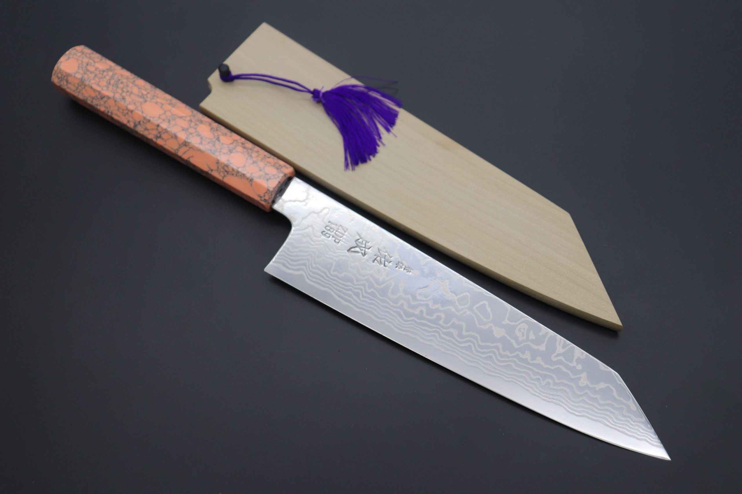 This Sukenari ZDP-189 Nickel Damascus knife is fitted with a Innovative Octagonal Soft Pink Turquoise Composite Stone Handle. For safekeeping, this knife comes with a matching Magnolia wood Saya (Sheath) with a black pakkawood Saya pin.