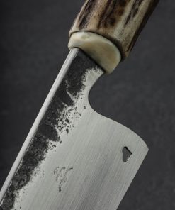 By bladesmith Toma Fenes of Romania, the Damascus Heart Chef is an exquisite and versatile culinary tool built for the rigors of every-day cooking, forged by hand from 26c3 ‘Spicy White’ carbon steel to create a Western-style blade featuring a beautiful heart detail. Altogether, it’s enough to make you fall in love. Wonderfully balanced just at the blade’s heel, the silky, satin finished bevels are superbly shaped for outstanding cutting performance, the convex geometry slimming to a sharp, thin, near-zero edge. Above, the blade’s comfortably rounded and polished spine tapers steadily from handle forward, delivering a dynamic and evened feel along with a very slim, needle-like tip perfect for detail work and precision slicing. With forge-finished blade flats that complement the handle’s natural, rustic aesthetic, 19-year-old Toma shows that age is just a number when it comes to the marriage of form and purpose-built function. The handle is sculpted of deer antler and inlaid with a handsome, domed cap of damascus in the rear, adding a beautiful touch to this one-of-a-kind kitchen knife. For the home cook and professional chef alike comes a world-class cutting tool from the newest artist to join our collection.