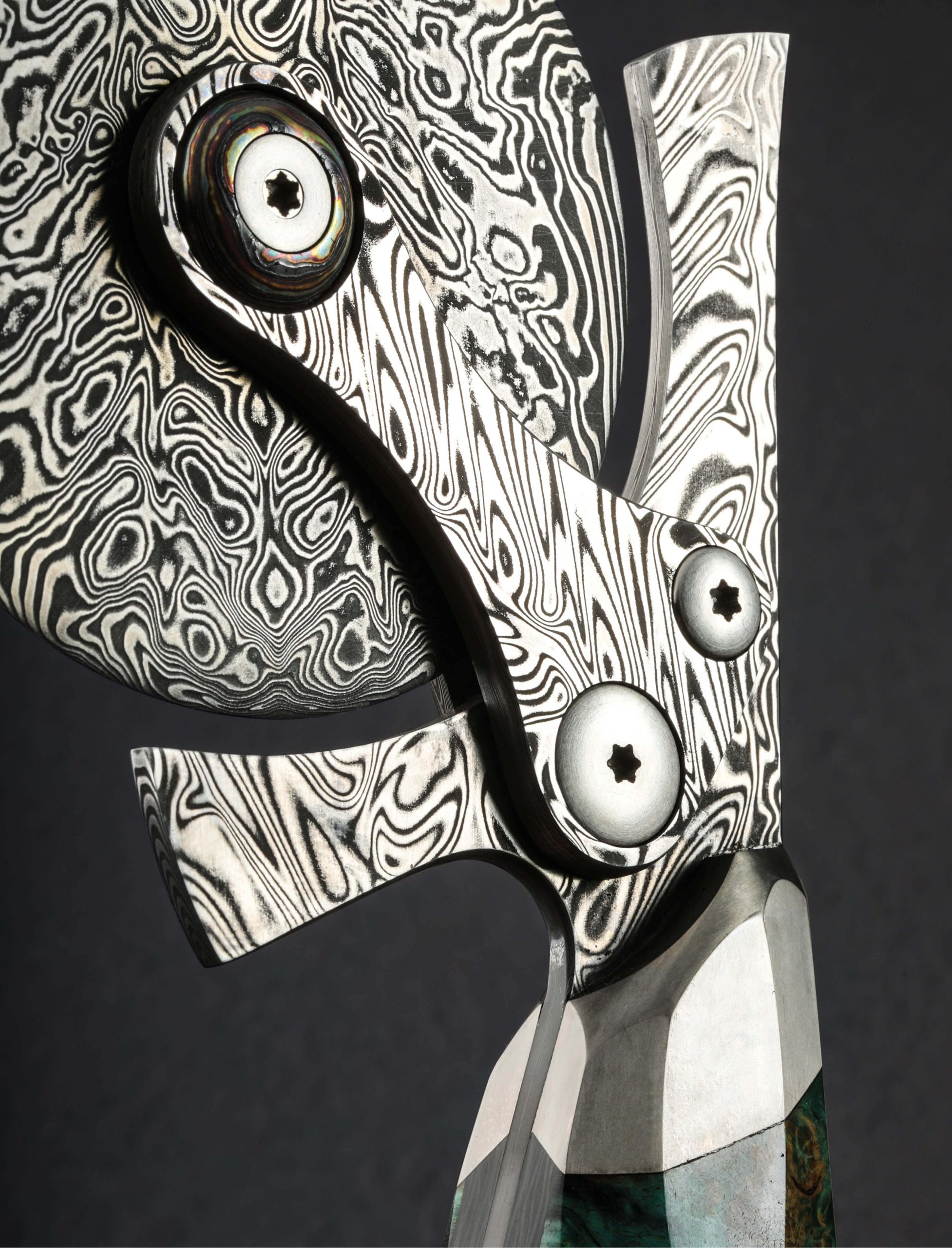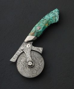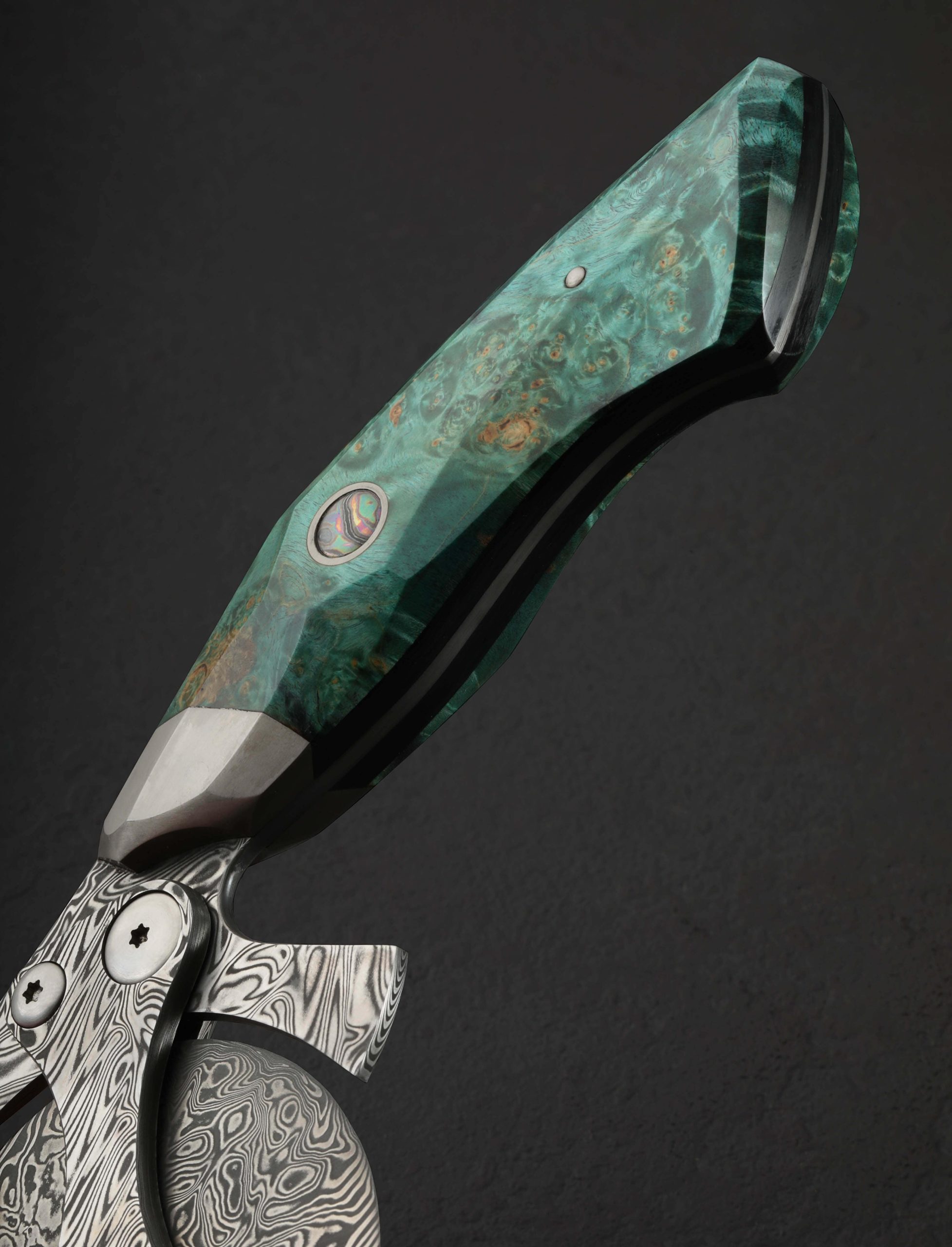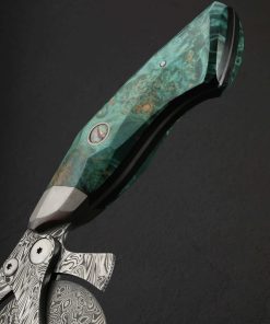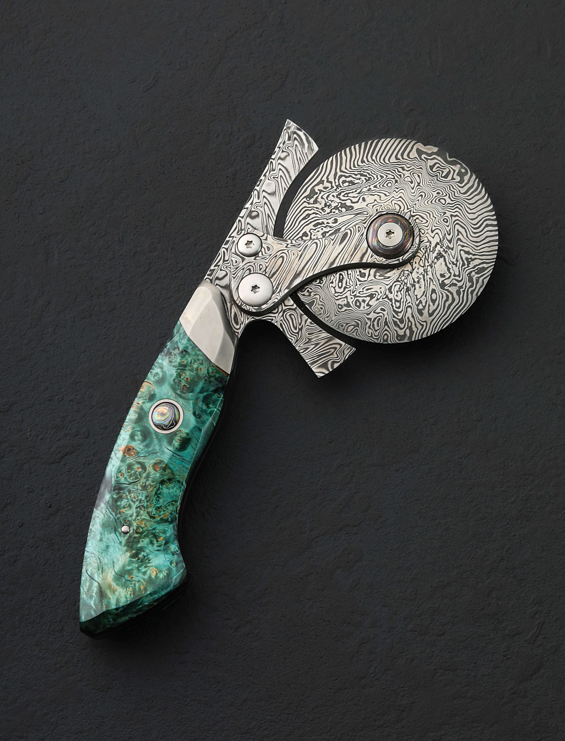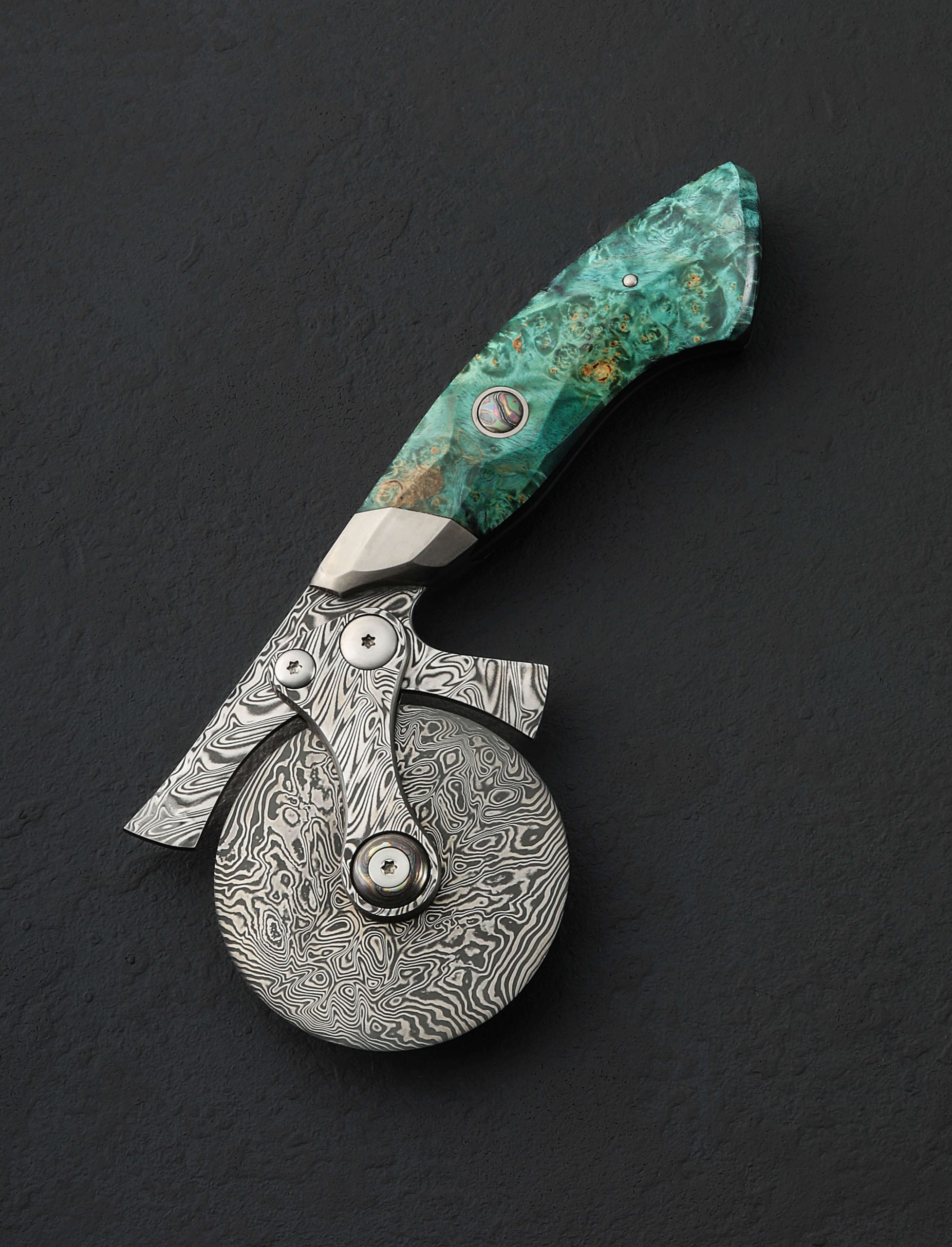 Wheel, arms, and frame of this striking, one-of-a-kind pizza tool are precision-crafted from Damasteel stainless damascus by the object’s designer and maker, Filipino artist Sean Alonzo. In a style that this talented craftsman has honed over recent years, and quickly developed a following because of, this pizza cutter is as comfortable in the hand and utile in the kitchen as it is exquisite to behold. Each object Sean creates at his studio in Metro Manila is unique, and that could be considered an understatement here. For comfort and control while maneuvering the three inch wheel that turns on phosphor bronze washers, Sean layers dyed and stabilized box elder burl, which has been sculpted to hug the hand, atop thick liners of carbon fiber, that in turn flank the frame’s tapered Damasteel tang to form the gorgeous handle. At its front face, dovetailed and faceted titanium bolsters complete the handle build. And Sean doesn’t stop there: a titanium ring surrounds a titanium and zirconium timascus accent pin at the handle’s center. This detail in turn matches the timascus collars that encircle the titanium hardware which secures the wheel to its arms. A rare and gourmet pizza experience awaits.