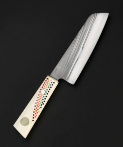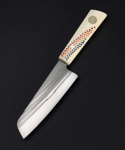 California artist Don Carlos Andrade’s contribution to The Art of Cutlery, a vegetable cleaver named “Double Rainbow,” on show during summer 2024 in Tribeca, NYC, exemplifies this long-time maker’s unique and often-whimsical aesthetic style as well as his function-forward technical excellence informed by his time in fine-dining kitchen. The blade is forged by hand, shaped with Don’s pronounced convex geometry, and given a striking ‘rainbow quench’ during the hardening process. The handle, sculpted in his recognizable, shield-style wa handle rendition, features detail carvings, a rainbow inlay, a single mosaic pin, and translucent green ferrule. Sharp and ready to use, this knife is built for cooking daily.