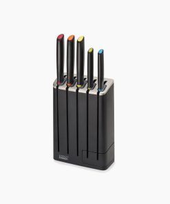 This stylish set comprises five knives with Japanese stainless-steel blades and ergonomic handles plus a smart, slimline knife block that features easy-access knife slots and a removable, two-stage ceramic sharpener in the base.